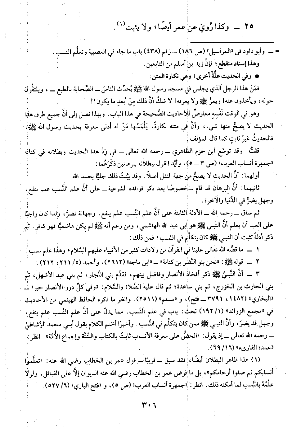 (¬١) هذا ظاهر البطلان أيضًا، فقد سبق -قريبًا- قول عمر بن الخطاب رضي الله عنه: "تعلَّموا أنسابكم ثم صلوا أرحامكم"، بل ما فرض عمر بن الخطاب رضي الله عنه الديوان إلَّا على القبائل، ولولا علْمُهُ بالنَّسب لما أمكنه ذلك. انظر: "جمهرة أنساب العرب" (ص ٥)، و"فتح الباري" (٦/ ٥٢٧).