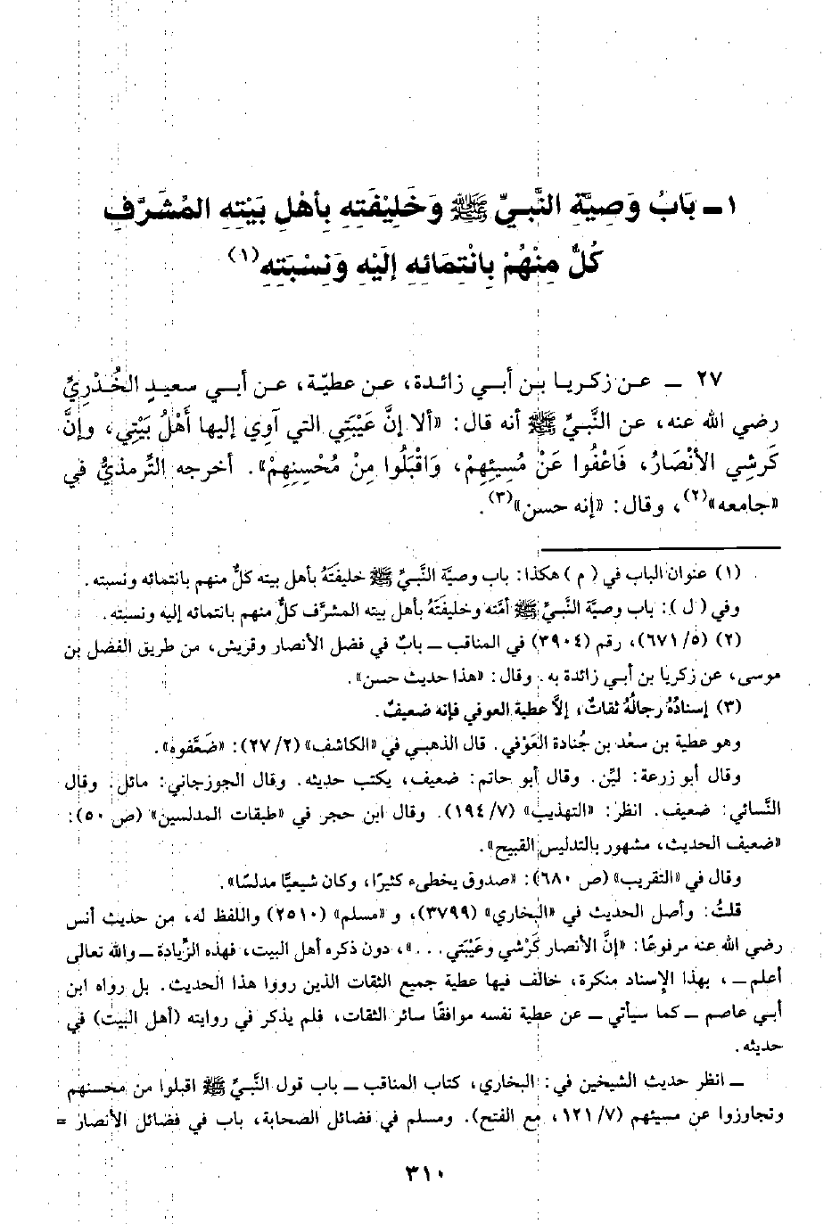 ٢٧ - عن زكريا بن أبي زائدة، عن عطيّة، عن أبي سعيدِ الخُدْرِيِّ رضي الله عنه، عن النَّبيِّ -صلى الله عليه وسلم- أنه قال: "ألا إنَّ عَيْبَتِي التي آوِي إليها أَهْلُ بَيْتِي، وإنَّ كَرشِي الأنْصَارُ، فَاعْفُوا عَنْ مُسِيئِهِمْ، وَاقْبَلُوا مِنْ مُحْسِنِهِمْ". أخرجه التِّرمذيُّ في "جامعه" (¬٢)، وقال: "إنه حسن" (¬٣).
