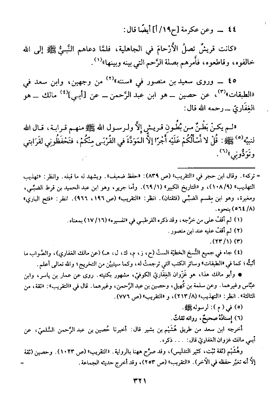 ٤٥ - وروى سعيد بن منصور في "سننه" (¬٢) من وجهين، وابن سعد في "الطبقات" (¬٣)، عن حصين -هو ابن عبد الرَّحمن- عن [أبي] (¬٤) مالك -هو الغِفَاريّ- رحمه الله قال: