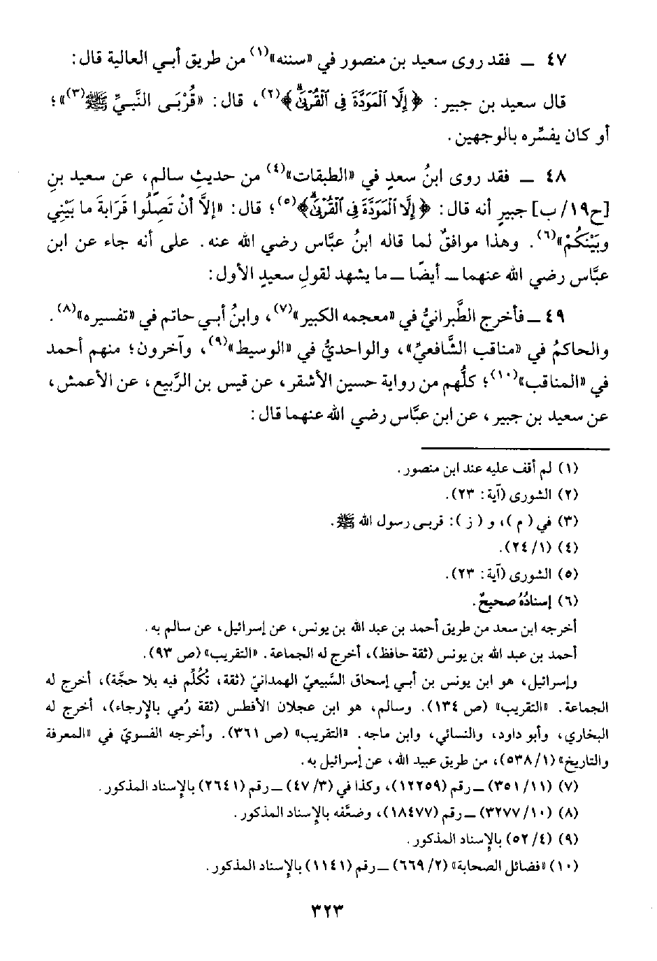 ٤٨ - فقد روى ابنُ سعدٍ في "الطبقات" (¬٤) من حديثِ سالمٍ، عن سعيد بنِ [ح ١٩/ ب] جبيرٍ أنه قال: {إِلَّا الْمَوَدَّةَ فِي الْقُرْبَى} (¬٥)؛ قال: "إلَّا أنْ تَصِلُوا قَرَابةَ ما بَيْنِي وبَيْنكُمْ" (¬٦). وهذا موافقٌ لما قاله ابنُ عبَّاس رضي الله عنه. على أنه جاء عن ابن عبَّاس رضي الله عنهما -أيضًا- ما يشهد لقولِ سعيدٍ الأول: