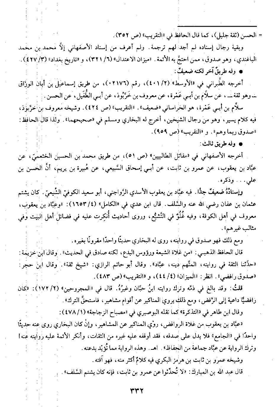 وإسنادُهُ ضعيفٌ جدًّا. فيه عبَّاد بن يعقوب الأسدي الرَّواجني، أبو سعيد الكوفيّ الشِّيعيّ كان يشتم عثمان بن عفان رضي الله عنه والسَّلف. قال ابن عدي في "الكامل" (٤/ ١٦٥٣): "وعبَّاد بن يعقوب، معروف في أهل الكوفة، وفيه غُلُوٌ في التَّشيُّع، وروى أحاديث أُنكِرت عليه في فضائل أهل البيت وفي مثالب غيرهم".