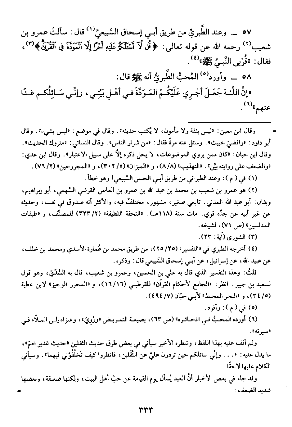 ٥٧ - وعند الطَّبريِّ من طريق أبي إسحاق السَّبيعيَّ (¬١) قال: سألتُ عمرو بن شعيب (¬٢) رحمه الله عن قوله تعالى: {قُلْ لَا أَسْأَلُكُمْ عَلَيْهِ أَجْرًا إِلَّا الْمَوَدَّةَ فِي الْقُرْبَى} (¬٣)، فقال: "قُرْبى النَّبيِّ -صلى الله عليه وسلم-" (¬٤).