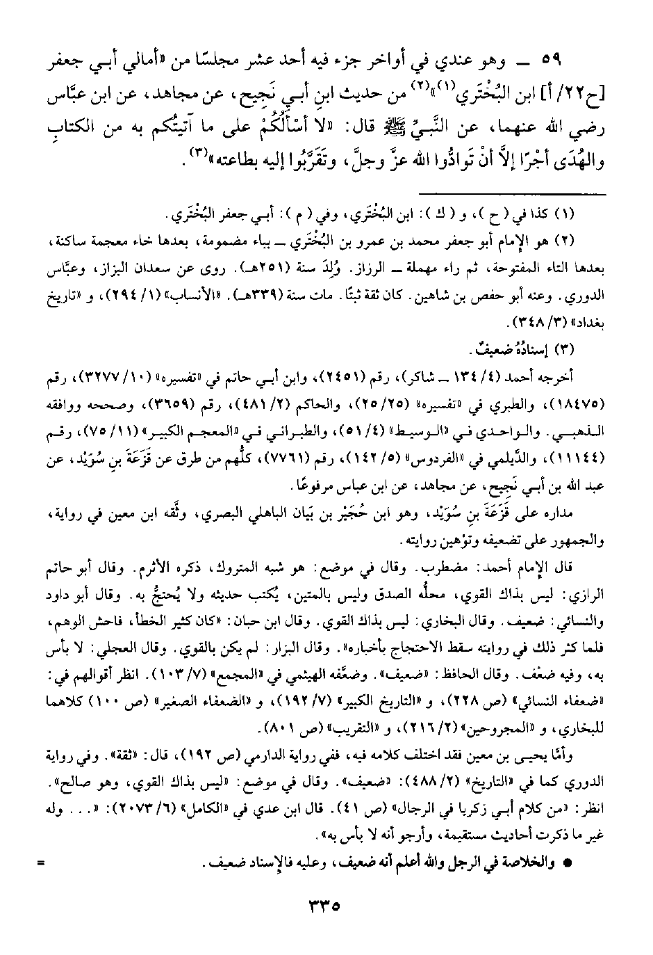 ٥٩ - وهو عندي في أواخر جزء فيه أحد عشر مجلسًا من "أمالي أبي جعفر [ح ٢٢/ أ] ابن البُخْتَري (¬١) " (¬٢) من حديث ابنِ أبيِ نَجِيح، عن مجاهد، عن ابن عبَّاس رضي الله عنهما، عن النَّبيِّ -صلى الله عليه وسلم- قال: "لا أسْأَلُكُمْ على ما آتيتُكم به من الكتابِ والهُدَى أجْرًا إلَّا أن تَوادُّوا الله عز وجلَّ، وتَقَرَّبُوا إليه بطاعته" (¬٣).
