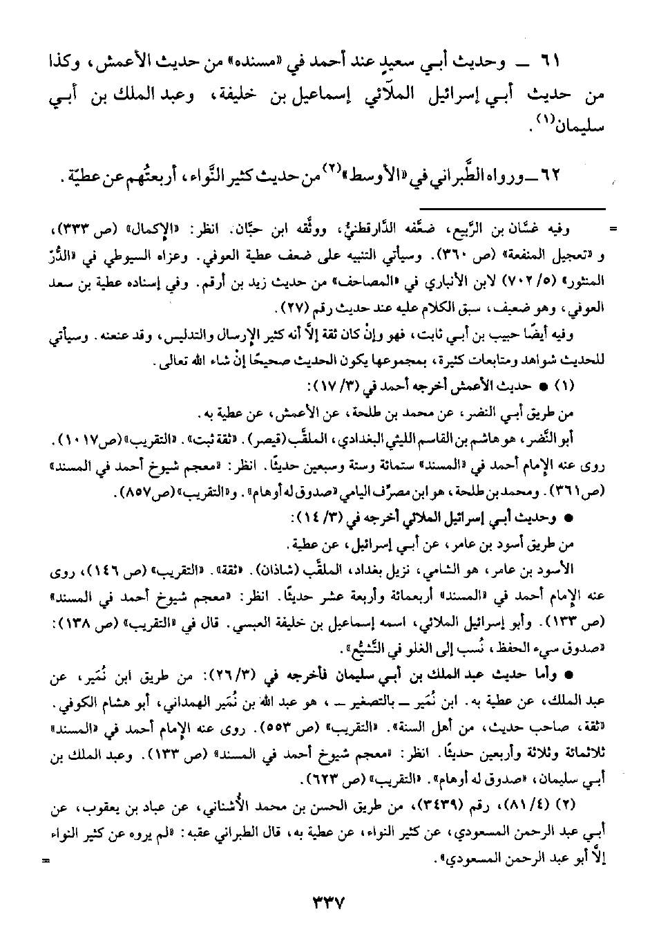 • وأما حديث عبد الملك بن أبي سليمان فأخرجه في (٣/ ٢٦): من طريق ابن نُمَير، عن عبد الملك، عن عطية به. ابن نُمَير -بالتصغير-, هو عبد الله بن نُمَير الهمداني، أبو هشام الكوفي. "ثقة، صاحب حديث، من أهل السنة". "التقرب" (ص ٥٥٣). روى عنه الإمام أحمد في "المسند" ثلاثمائة وثلاثة وأربعين حديثًا. انظر: "معجم شيوخ أحمد في المسند" (ص ١٣٣). وعبد الملك بن أبي سليمان، "صدوق له أوهام". "التقريب" (ص ٦٢٣).
