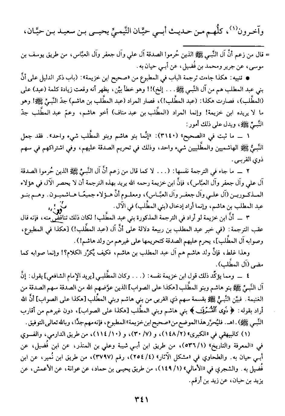 ٣ - أن ابن خزيمة لو أراد في الترجمة المذكورة بني عبد المطَّلب! لكان ذلك تناقضًا منه، فإنه قال عقب الترجمة! (في خبر عبد المطلب بن ربيعة دلالة على أن آل (عبد المطَّلب! ) [هكذا في المطبوع، وصوابه آل المطَّلب]، يحرم عليهم الصدقة كتحريمها على غيرهم من ولد هاشم).