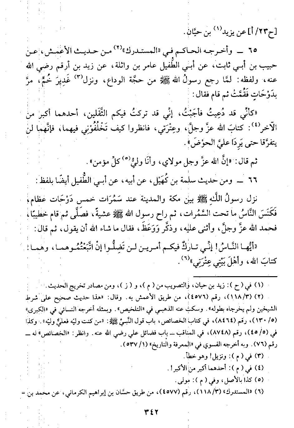 "أيُّها النَّاسُ! إنِّي تاركٌ فيكم أمرين لن تَضِلُّوا إنْ اتَّبَعْتُمُوهما، وهما: كتابَ الله، وأهْلَ بَيْتِي عِتْرَتِي" (¬٦).
