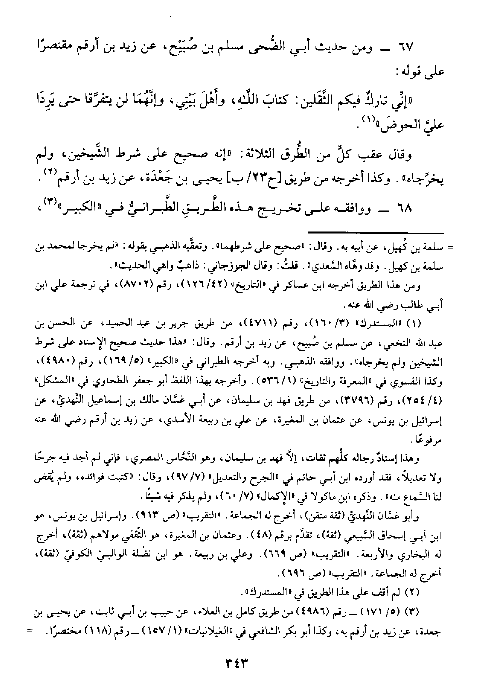 (¬١) "المستدرك" (٣/ ١٦٠)، رقم (٤٧١١)، من طريق جرير بن عبد الحميد، عن الحسن بن عبد الله النخعي، عن مسلم بن صُبيح، عن زيد بن أرقم. وقال: "هذا حديث صحيح الإسناد على شرط الشيخين ولم يخرجاه". ووافقه الذهبي. وبه أخرجه الطبراني في "الكبير" (٥/ ١٦٩)، رقم (٤٩٨٠)، وكذا الفسوى في "المعرفة والتاريخ" (١/ ٥٣٦). وأخرجه بهذا اللفظ أبو جعفر الطحاوي في "المشكل" (٤/ ٢٥٤)، رقم (٣٧٩٦)، من طريق فهد بن سليمان، عن أبي غسَّان مالك بن إسماعيل النَّهديِّ، عن إسرائيل بن يونس، عن عثمان بن المغيرة، عن علي بن ربيعة الأسدي، عن زيد بن أرقم رضي الله عنه مرفوعًا.
