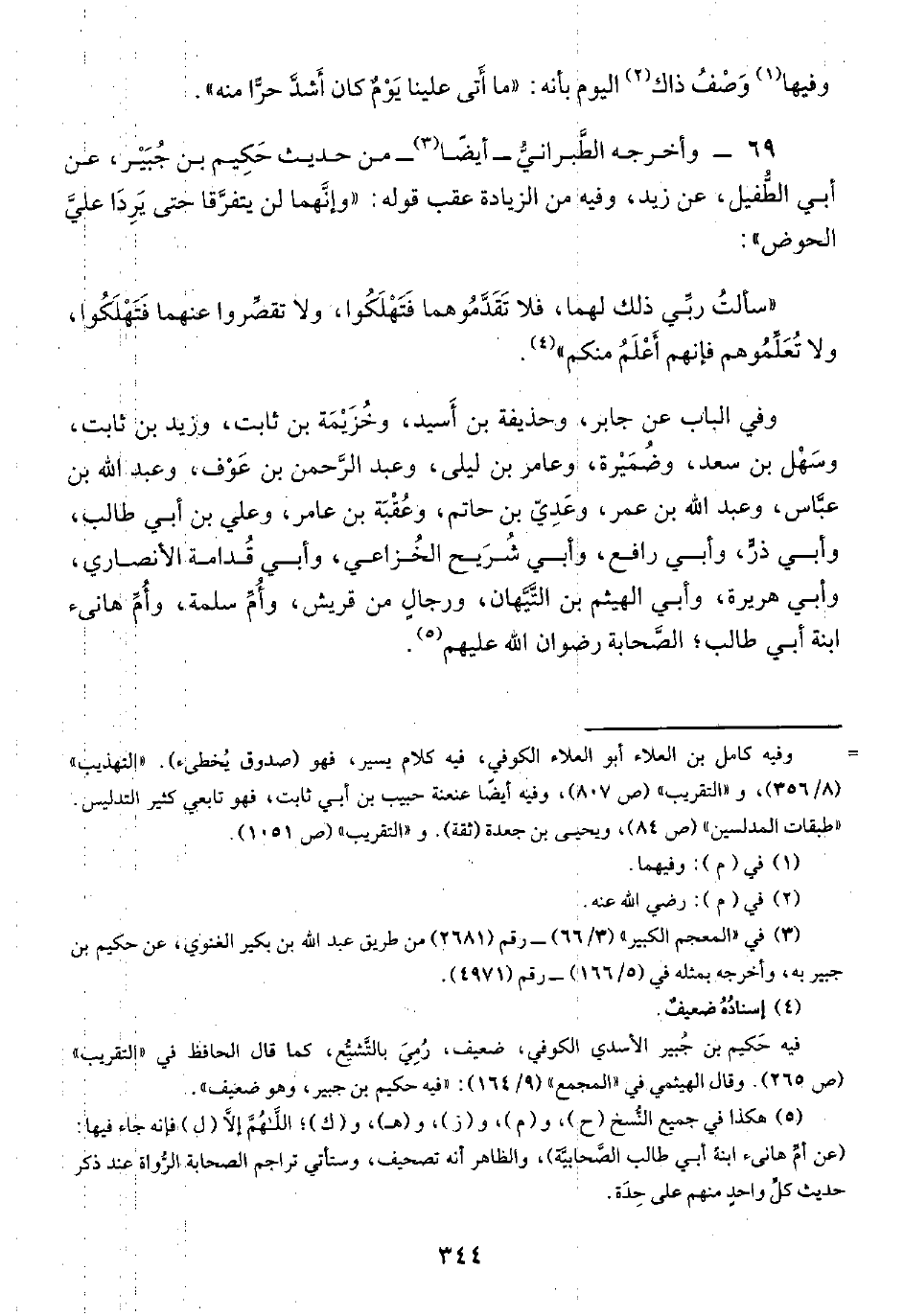٦٩ - وأخرجه الطَّبرانيُّ -أيضًا (¬٣) - من حديث حَكِيم بن جُبَيْر، عن أبي الطُّفيل، عن زيد، وفيه من الزيادة عقب قوله: "وإنَّهما لن يتفرَّقا حتى يَرِدَا عليَّ الحوض":