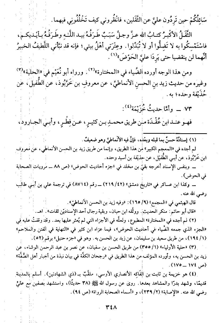 الثَّقَلُ الأكْبرُ كتابُ الله عزَّ وجلَّ سَبَبٌ طَرَفُهُ بيد اللهِ وطَرَفُهُ بأيْديكم، فاسْتَمْسِكُوا به لا تَضِلُّوا أو لا تُبَدِّلوا. وعِتْرَتي أهْلُ بيتي؛ فإنه قد نبَّأني اللَّطيفُ الخبيرُ أنَّهما لن ينقضيا حتى يَرِدَا عليَّ الحَوْضَ" (¬١).