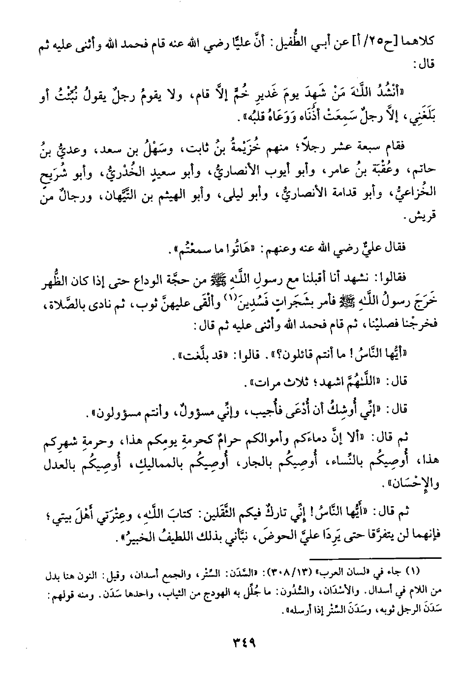 "أنْشُدُ اللهَ مَنْ شَهدَ يومَ غَديرِ خُمٍّ إلَّا قام، ولا يقومُ رجلٌ يقولُ نُبِّئْتُ أو بَلَغَنِي، إلَّا رجلٌ سَمِعَتْ أذُنَاه وَوَعَاة قلبُه".