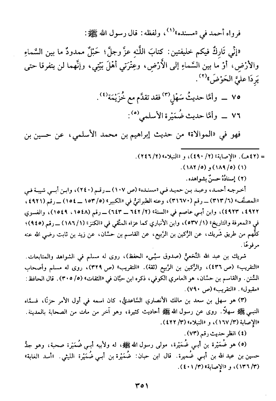 "إنِّي تَارِكٌ فيكم خليفتين: كتابَ الله عزَّ وجلَّ؛ حَبْلٌ ممدودٌ ما بين السَّماءِ والأرْضِ، أوْ ما بين السَّماءِ إلى الأَرْضِ، وعِتْرَتي أهْلَ بَيْتِي، وإنَّهما لن يتفرقا حتى يَرِدَا عليَّ الحَوْضَ" (¬٢).
