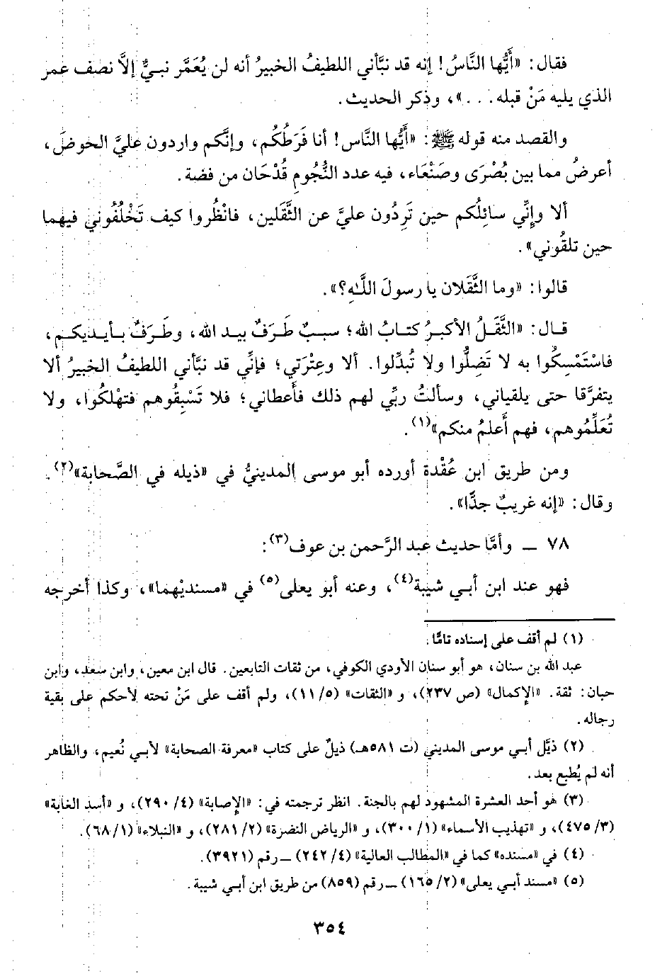 قال: "الثقَلُ الأكبرُ كتابُ الله؛ سببٌ طَرَفٌ بيد الله، وطَرَفٌ بأيديكم، فاسْتَمْسِكُوا به لا تَضِلُّوا ولا تُبدِّلوا. ألا وعِتْرَتي؛ فإنِّي قد نبَّأني اللطيفُ الخبيرُ ألا يتفرَّقا حتى يلقياني، وسألتُ ربي لهم ذلك فأَعطاني؛ فلا تَسْبقُوهم فتهْلكُوا، ولا تُعَلِّمُوهم، فهم أَعلمُ منكم" (¬١).