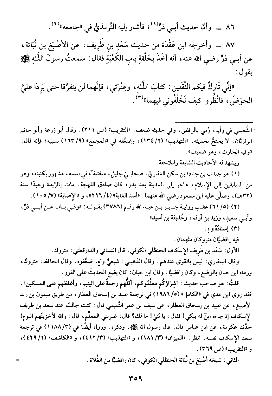 "إنِّي تَارك فيكم الثَّقَلين: كتابَ اللَّه، وعِتْرَتي؛ فإنَّهما لن يتفرَّقا حتى يَرِدَا عليَّ الحوْضَ، فانْظُروا كيف تَخْلُفُوني فيهما" (¬٣).