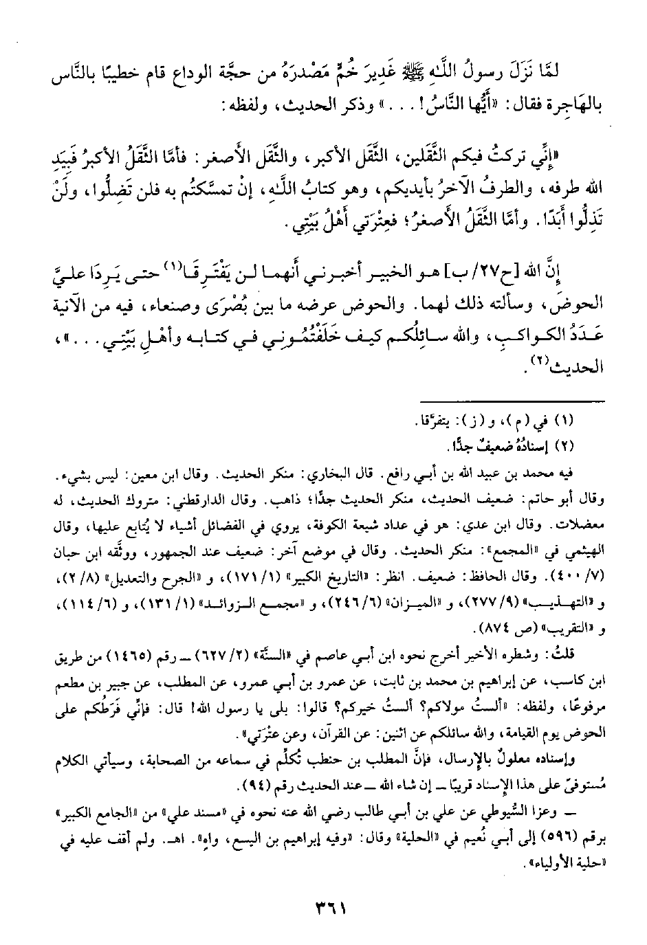 "إِنِّي تركتُ فيكم الثَّقَلين، الثَّقَل الأكبر، والثَّقَل الأَصغر: فأمَّا الثَّقَلُ الأكبرُ فَبيَدِ الله طرفه، والطرفُ الآخرُ بأيديكم، وهو كتابُ الله، إنْ تمسَّكتُم به فلن تَضِلُّوا، وَلَنْ تَذِلُوا أَبَدًا. وأمَّا الثَّقَلُ الأَصغرُ؛ فعِتْرَتي أهْلُ بَيْتِي.