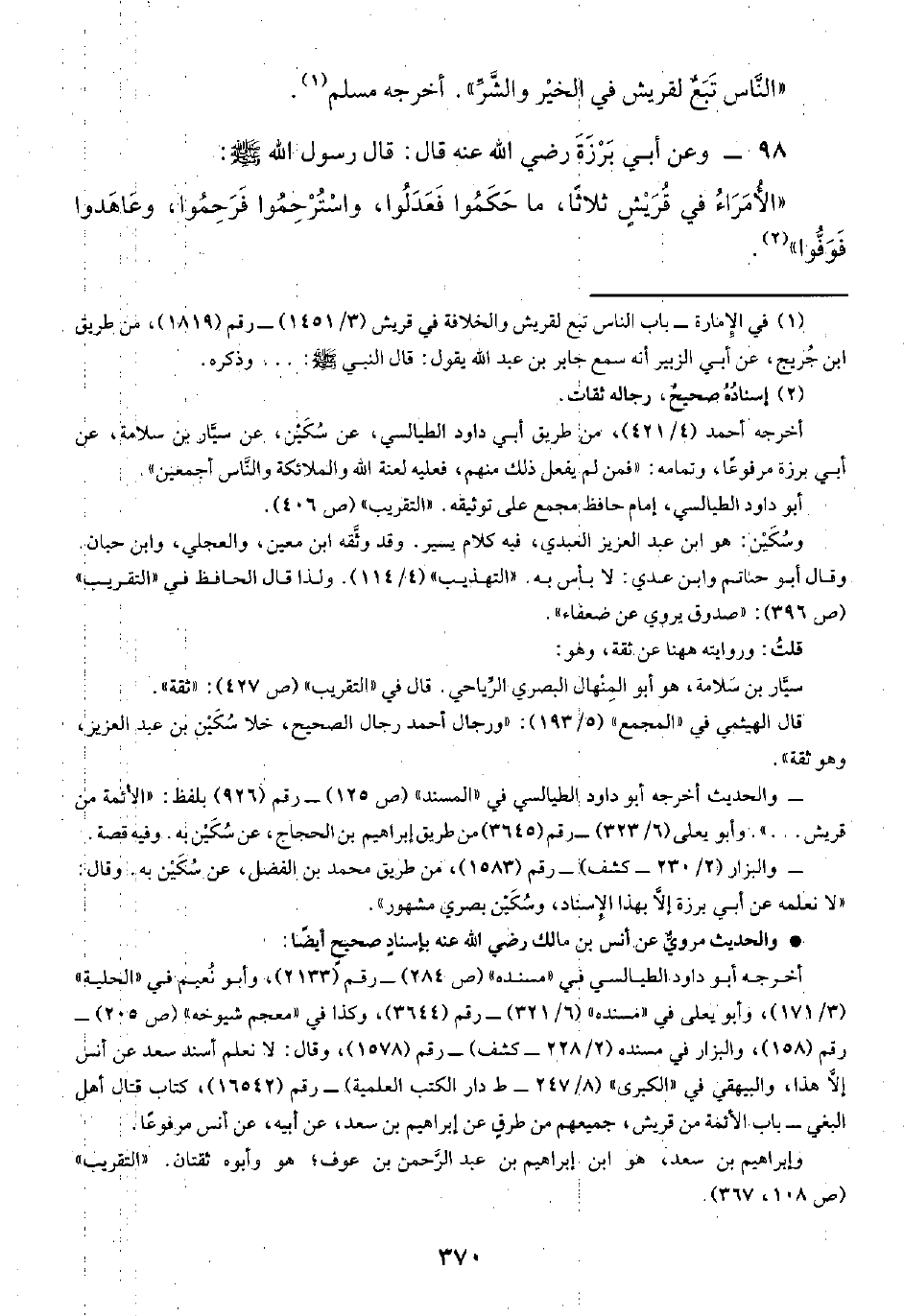 ٩٨ - وعن أبي بَرْزَةَ رضي الله عنه قال: قال رسول الله -صلي الله عليه وسلم-: "الأمَرَاءُ في قُرَيْش ثلاثًا، ما حَكَمُوا فَعَدَلُوا، واسْتُرْحِمُوا فَرَحِمُوا، وعَاهَدوا فَوَفُّوا" (¬٢).