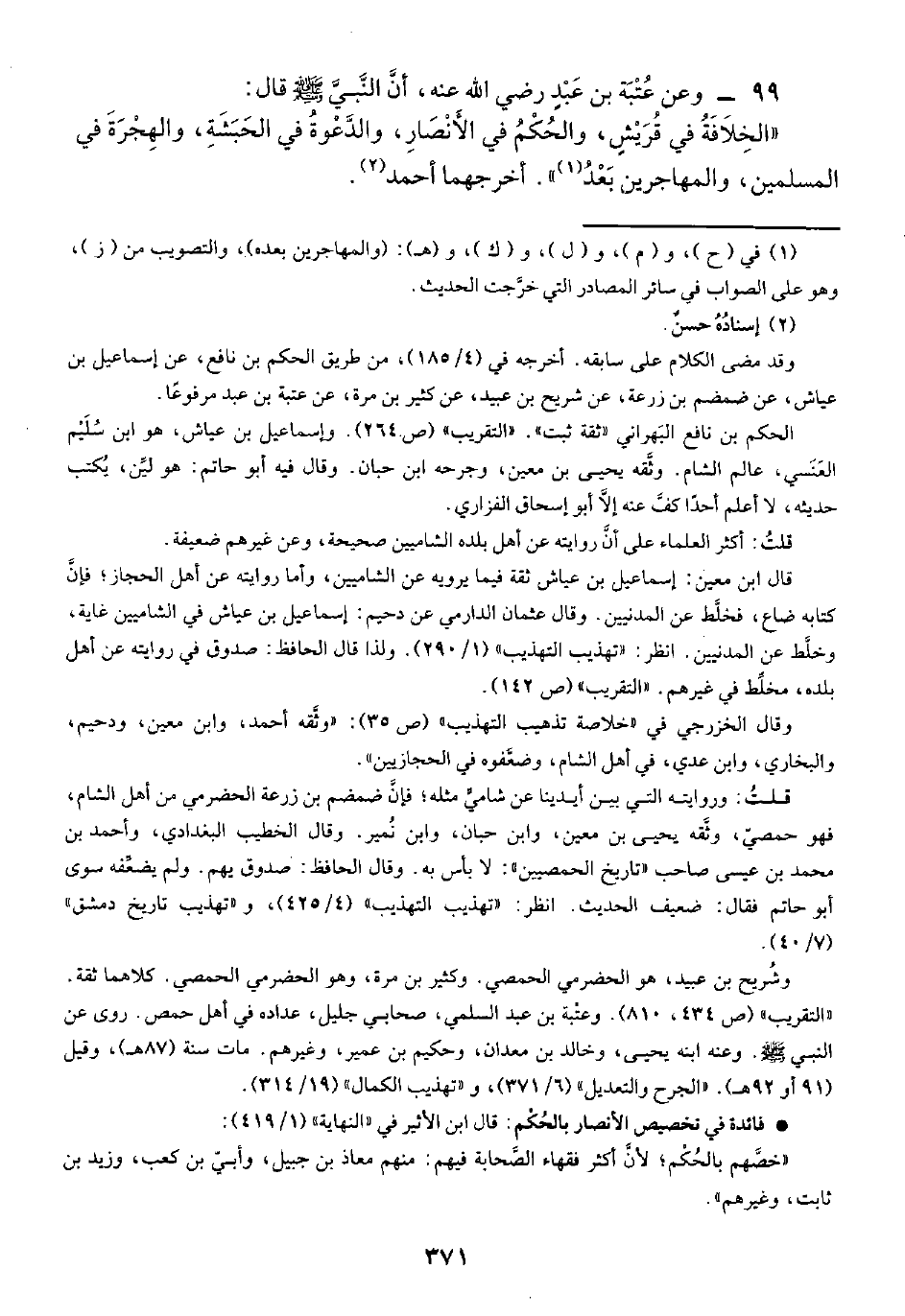 الحكم بن نافع البَهراني "ثقة ثبت". "التقريب" (ص ٢٦٤). وإسماعيل بن عياش، هو ابن سُليْم العَنسَي، عالم الشام. وثَّقه يحيى بن معين، وجرحه ابن حبان. وقال فيه أبو حاتم: هو ليِّن، يكتب حديثه، لا أعلم أحدًا كفَّ عنه إلَّا أبو إسحاق الفزاري.