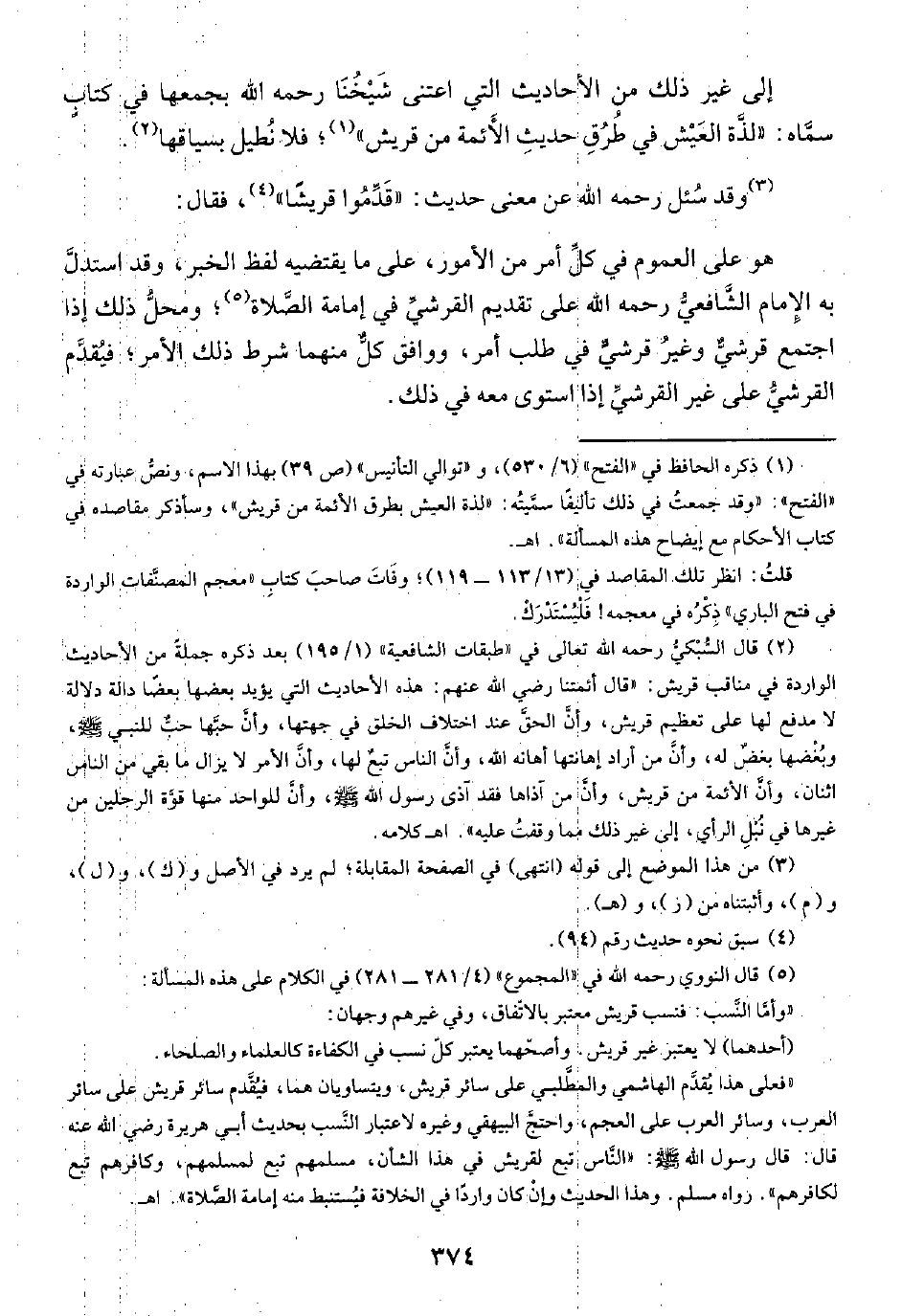 إلى غير ذلك من الأحاديث التي اعتنى شَيخُنَا رحمه الله بجمعها في كتابٍ سمَّاه: "لذة العَيْش في طُرُقِ حديثِ الأَئمة من قريش" (¬١)؛ فلا نُطيل بسياقها (¬٢).