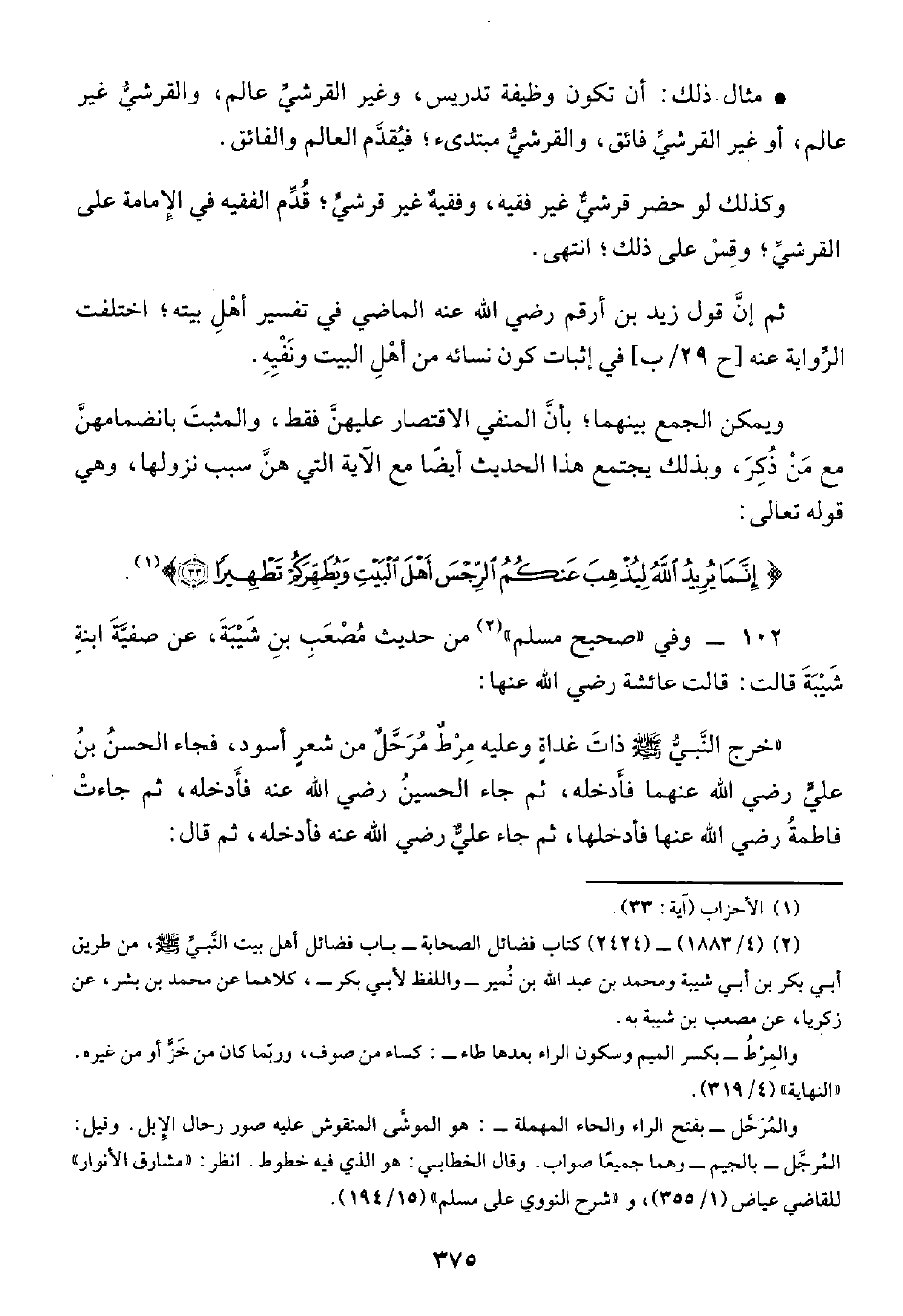 "خرج النَّبيُّ -صلى الله عليه وسلم- ذاتَ غداةٍ وعليه مِرْطٌ مُرَحَّلٌ من شعرٍ أسود، فجاء الحسنُ بنُ عليٍّ رضي الله عنهما فأَدخله، ثم جاء الحسينُ رضي الله عنه فأَدخله، ثم جاءتْ فاطمةُ رضي الله عنها فأدخلها، ثم جاء عليٌّ رضي الله عنه فأَدخله، ثم قال: