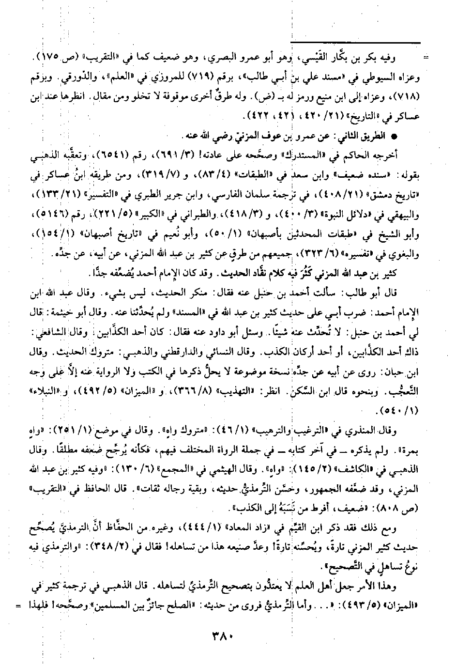 وقال المنذري في "الترغيب والترهيب" (١/ ٤٦): "متروك واهٍ". وقال في موضع (١/ ٢٥١): "واهٍ بمرة". ولم يذكره -في آخر كتابه- في جملة الرواة المختلف فيهم، فكأنه يُرجِّح ضعفه مطلقًا. وقال الذهبي في "الكاشف" (٢/ ١٤٥): "واهٍ". وقال الهيثمي في "المجمع" (٦/ ١٣٠): "وفيه كثير بن عبد الله المزني، وقد ضعَّفه الجمهور، وحسَّن التَّرمذيُّ. حديثه، وبقية رجاله ثقات". قال الحافظ في "التقريب" (ص ٨٠٨): "ضعيف، أفرط من نَسَبَة إلى الكذب".