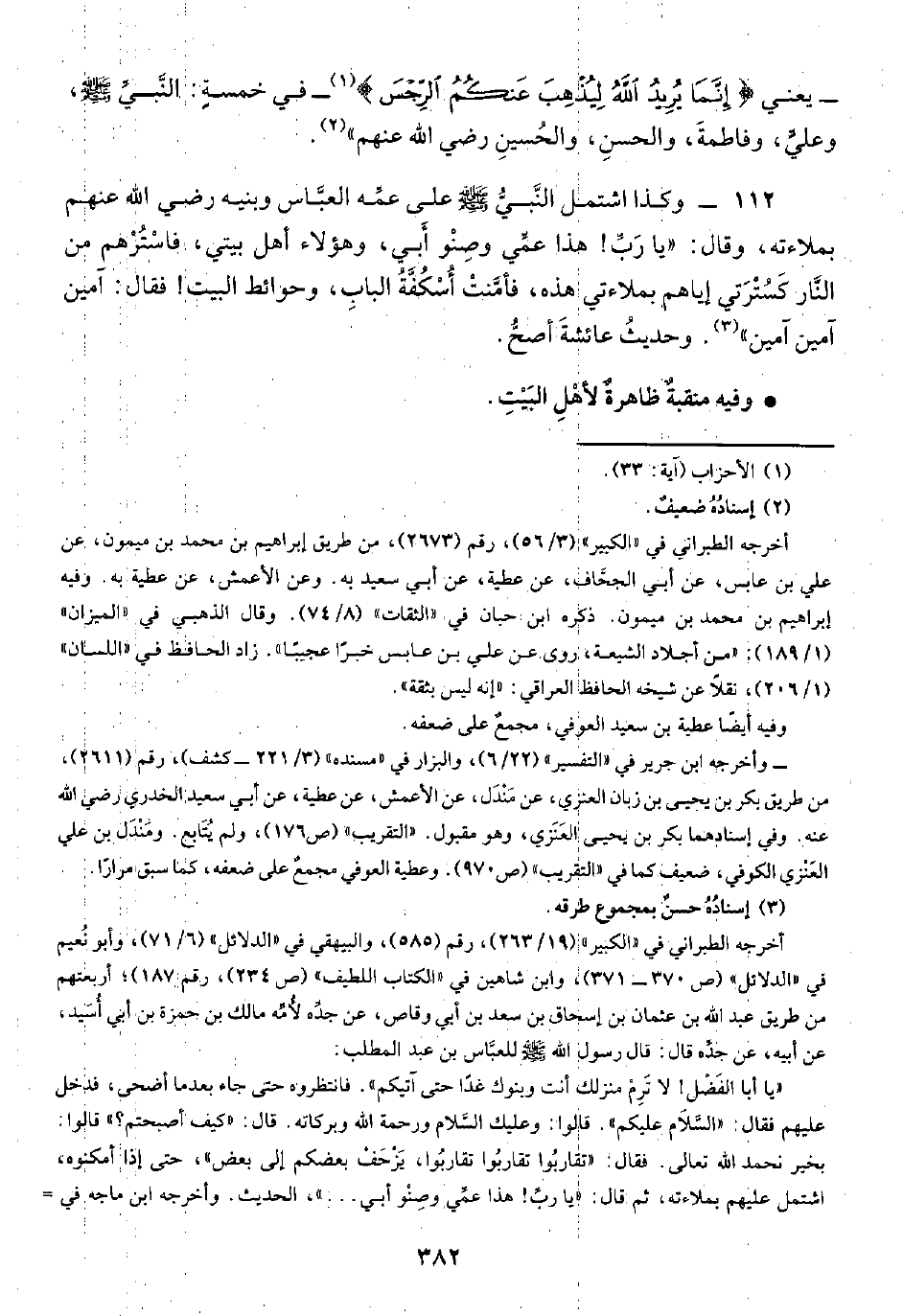 ١١٢ - وكذا اشتمل النَّبيُّ -صلى الله عليه وسلم- على عمَّه العبَّاس وبنيه رضي الله عنهم بملاءته، وقال: "يا رَبِّ! هذا عمِّي وصِنْو أَبي، وهؤلاء أهل بيتي، فاسْتُرْهم من النار كَسُتْرَتي إياهم بملاءتي هذه، فأمَّنتْ أسْكفَّةُ البابِ، وحوائط البيت! فقال: آمين آمين آمين" (¬٣). وحديثُ عائشةَ أصحُّ.