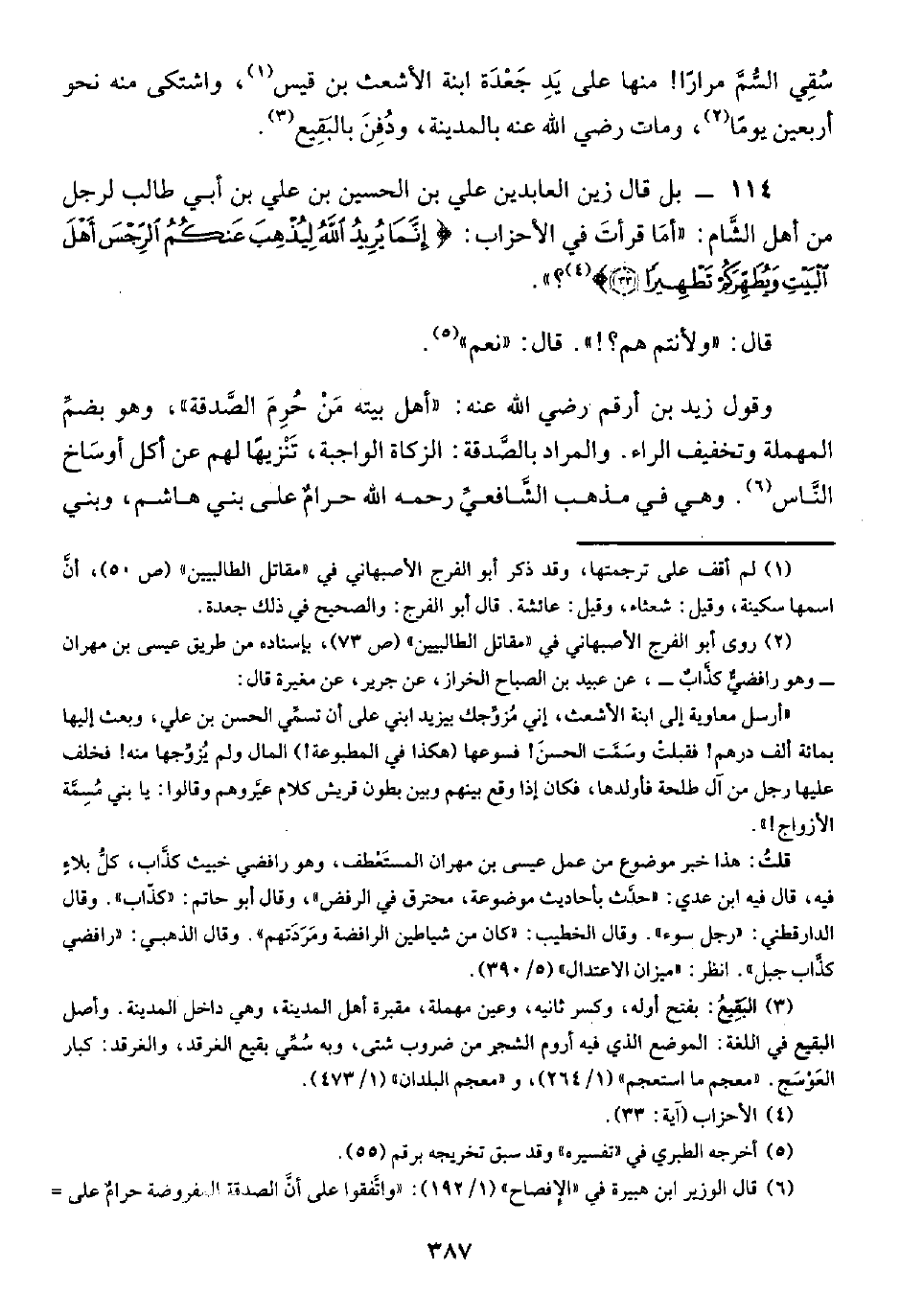١١٤ - بل قال زين العابدين علي بن الحسين بن علي بن أبي طالب لرجل من أهل الشَّام: "أمَا قرأتَ في الأحزاب: {إِنَّمَا يُرِيدُ اللَّهُ لِيُذْهِبَ عَنْكُمُ الرِّجْسَ أَهْلَ الْبَيْتِ وَيُطَهِّرَكُمْ تَطْهِيرًا (٣٣)} (¬٤)؟ ".