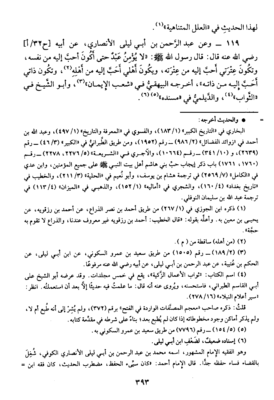 ١١٩ - وعن عبد الرَّحمن بن أبي ليلى الأنصاري، عن أبيه [ح ٣٢/ أ] رضي الله عنه قال: قال رسول الله -صلى الله عليه وسلم-: "لا يُؤْمِنُ عَبْدٌ حتى أَكُونَ أحبَّ إليه من نفسه، وتكُونَ عِتْرَتي أحبَّ إليه من عِتْرَته، ويكُونَ أَهْلي أَحَبَّ إليه من أهْلِهِ (¬٢)، وتكون ذاتي أحَبَّ إليه من ذاته"، أخرجه البيهقيُّ في "شعب الإيمان" (¬٣)، وأبو الشَّيخ في "الثَّواب" (¬٤)، والدَّيلميُّ في "مسنده" (¬٥) (¬٦).