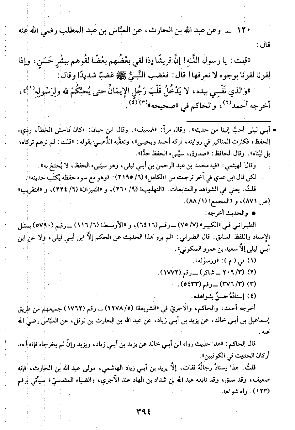 ١٢٠ - وعن عبد الله بن الحارث، عن العبَّاس بن عبد المطلب رضي الله عنه قال:
