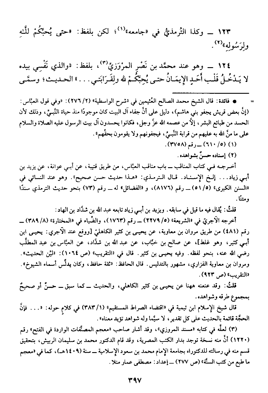 ١٢٤ - وهو عند محمَّد بن نَصْر المرْوَزي (¬٣)، بلفظ: "والذي نَفسي بيده لا يَدْخُل قَلْب أَحَدٍ الإِيمَانُ حتى يُحِبَّكمْ لله ولِقَرَابَتي ... " الحديث؛ وسمَّى