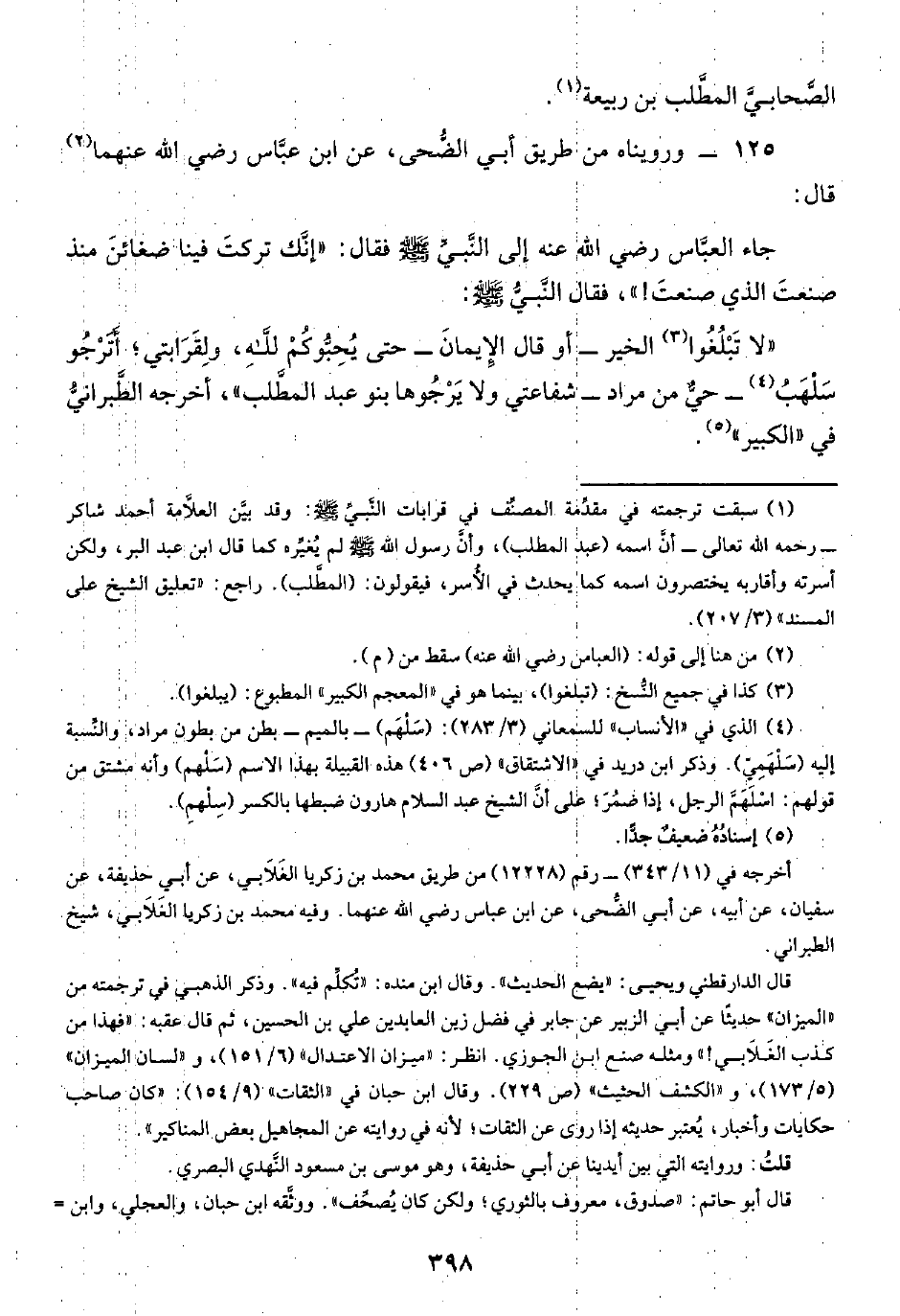 (¬١) سبقت ترجمته في مقدِّمة المصنِّف في قرابات النبي -صلى الله عليه وسلم-: وقد بيَّن العلَّامة أحمد شاكر -رحمه الله تعالى- أن اسمه (عبد المطلب)، وأن رسول الله -صلى الله عليه وسلم- لم يُغيِّره كما قال ابن عبد البر، ولكن أسرته وأقاربه يختصرون اسمه كما بحدث في الأُسر، فيقولون: (المطلب). راجع: "تعليق الشيخ على المسند" (٣/ ٢٠٧).