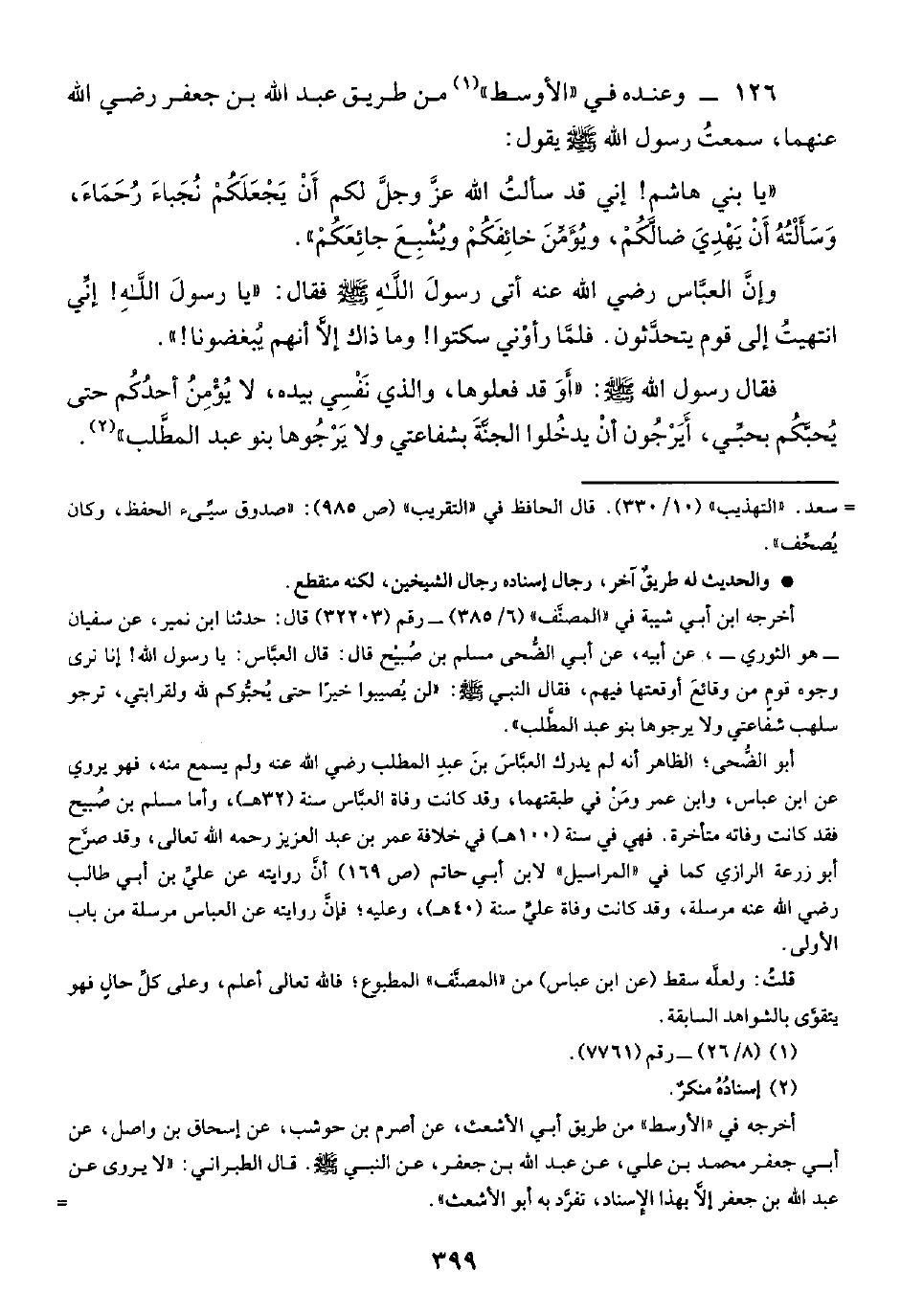 ١٢٦ - وعنده في "الأوسط" (¬١) من طريق عبد الله بن جعفر رضي الله عنهما، سمعتُ رسول الله -صلى الله عليه وسلم- يقول: