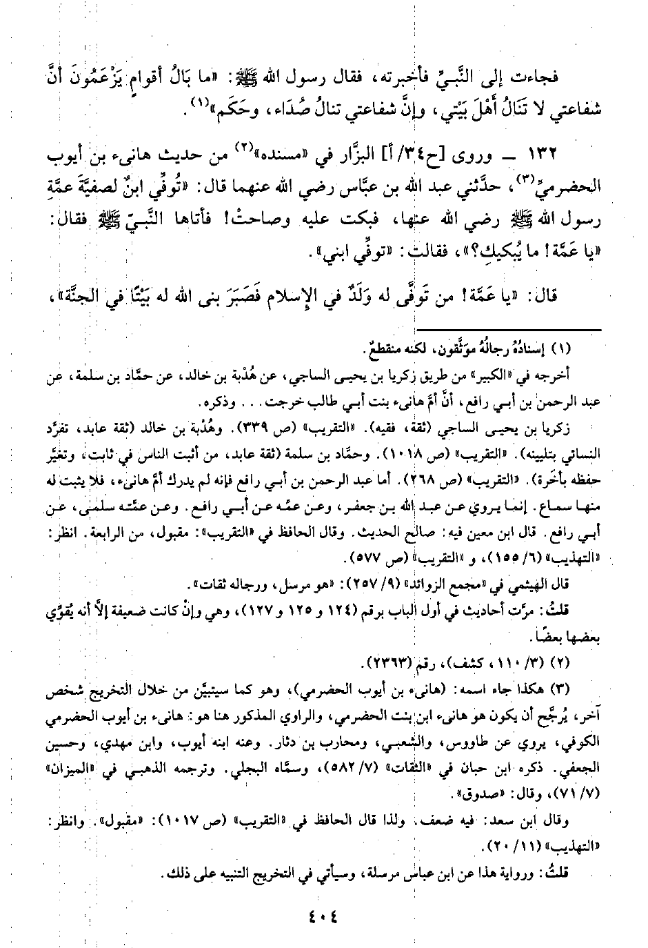 ١٣٢ - وروى البزَّار في "مسنده" (¬٢) من حديث هانئ بن أيوب الحضرميِّ (¬٣)، حدَّثني عبد الله بن عبَّاس -رضي الله عنهما- قال: "تُوفِّي ابنٌ لصفيَّةَ عمَّةِ رسول الله -صلى الله عليه وسلم-رضي الله عنها-، فبكت عليه وصاحتْ! فأتاها النَّبيّ -صلى الله عليه وسلم- فقال: "يا عَمَّة! ما يُبكيكِ؟ "، فقالت: "توفِّي ابني".