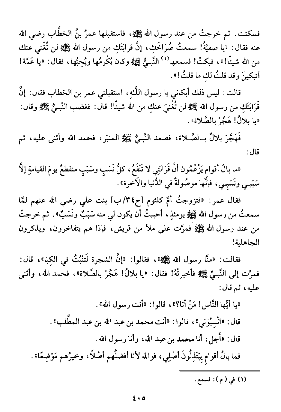 فقال عمر: "فتزوجتُ أمَّ كلثوم [ح ٣٤/ ب] بنت علي -رضي الله عنهم- لمَّا سمعتُ من رسول الله -صلى الله عليه وسلم- يومئذٍ، أحببتُ أن يكون لي منه سَبَبٌ ونَسَبٌ". ثم خرجتْ من عند رسول الله -صلى الله عليه وسلم- فمرَّت على ملأ من قريش، فإذا هم يتفاخرون، ويذكرون الجاهلية!