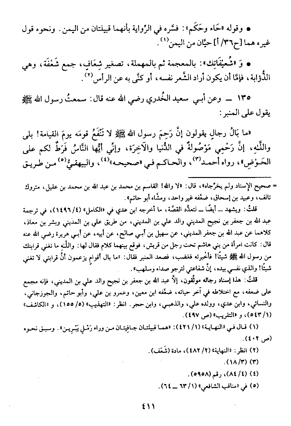 "ما بَالُ رجالٍ يقولون إنَّ رَحِمَ رسول الله -صلى الله عليه وسلم- لا تَنْفَعُ قومَه يومَ القيامة! بلى واللهِ، إنَّ رَحْمِي مَوْصُولةٌ في الدُّنيا والآخِرَة، وإنِّي أيُّها النَّاسُ فَرَطٌ لكم على الحَوْضِ"، رواه أحمد (¬٣)، والحاكم في "صحيحه" (¬٤)، والبيهقيُّ (¬٥) من طريق