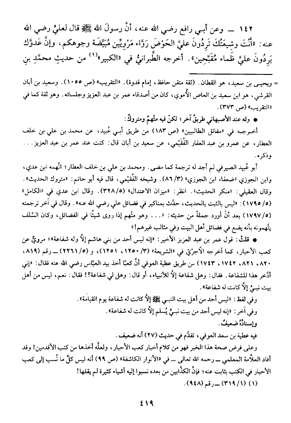 ١٤٢ - وعن أبي رافع -رضي الله عنه-، أن رسولَ الله -صلى الله عليه وسلم- قال لعليٍّ -رضي الله عنه-: "أَنْتَ وشِيعَتُكَ تَرِدُونَ عليَّ الحَوْضَ رَوَّاء مَرْوِيِّين مُبَيَّضَة وجوهكم، وإنَّ عَدوَّك يَرِدُونَ عليَّ ظَماء مقَبَّحِين". أخرجه الطَّبرانيُّ في "الكبير" (¬١) من حديثِ محمَّدِ بنِ