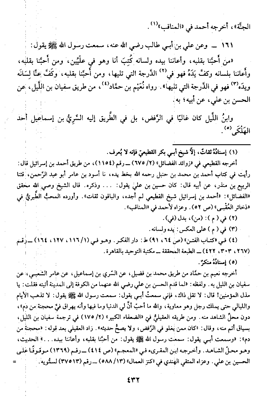"من أَحبَّنا بقلبه، وأعاننا بيده ولسانه كُتِبَ أنا وهو في علّيِّين، ومن أَحبَّنا بقلبه، وأَعاننا بلسانه وكفَّ يَدَهُ فهو في (¬٢) الدَّرجة التي تليها، ومن أَحبَّنا بقلبه، وكَفَّ عنَّا لِسَانَه ويدَه (¬٣) فهو في الدَّرجة التي تليها". رواه نُعَيْم بن حمَّاد (¬٤)، من طريق سفيان بن اللَّيل، عن الحسن بن علي، عن أبيه؛ به.