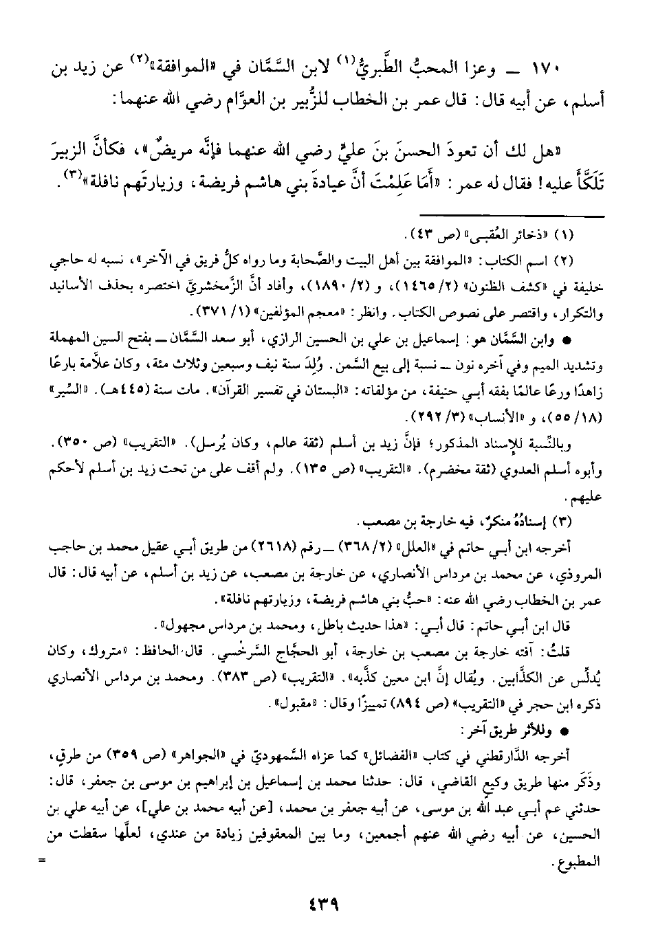 ١٧٠ - وعزا المحبُّ الطَّبريُّ (¬١) لابن السَّمَّان في "الموافقة" (¬٢) عن زيد بن أسلم، عن أبيه قال: قال عمر بن الخطاب للزُّبير بن العوَّام -رضي الله عنهما-.