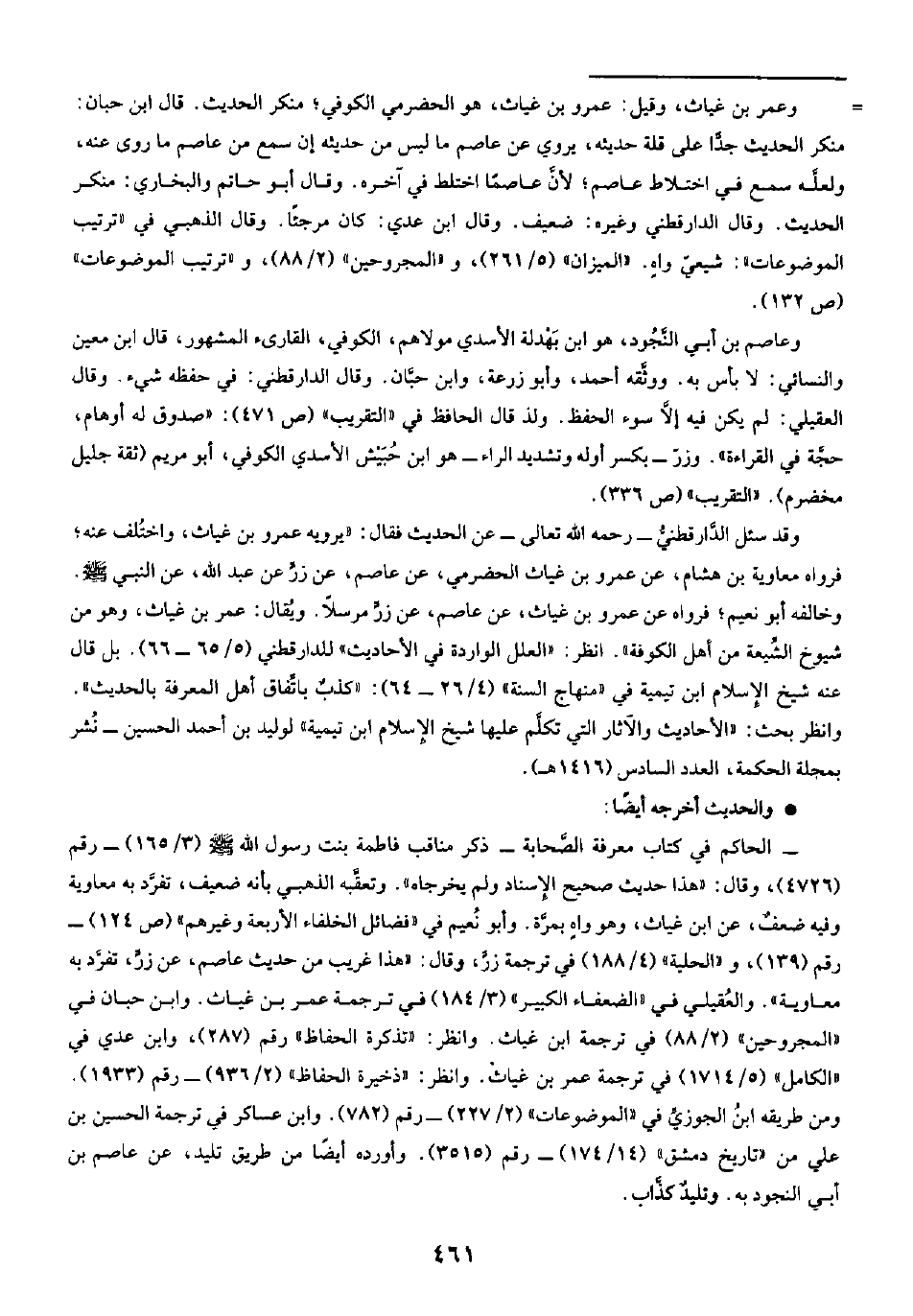 وقد سئل الدَّارقطنيُّ -رحمه الله تعالى- عن الحديث فقال: "يرويه عمرو بن غياث، واختُلف عنه؛ فرواه معاوية بن هشام، عن عمرو بن غياث الحضرمي، عن عاصم، عن زرٍّ عن عبد الله، عن النبي -صلى الله عليه وسلم-. وخالفه أبو نعيم؛ فرواه عن عمرو بن غياث، عن عاصم، عن زرٍّ مرسلًا. ويقال: عمر بن غياث، وهو من شيوخ الشِّيعة من أهل الكوفة". انظر: "العلل الواردة في الأحاديث" للدارقطني (٥/ ٦٥ - ٦٦). بل قال عنه شيخ الإِسلام ابن تيمية في "منهاج السنة" (٤/ ٢٦ - ٦٤): "كذبٌ باتِّفاق أهل المعرفة بالحديث". وانظر بحث: "الأحادث والآثار التي تكلم عليها شيخ الإسلام ابن تيمية" لوليد بن أحمد الحسين -نُشر بمجلة الحكمة، العدد السادس (١٤١٦ هـ).