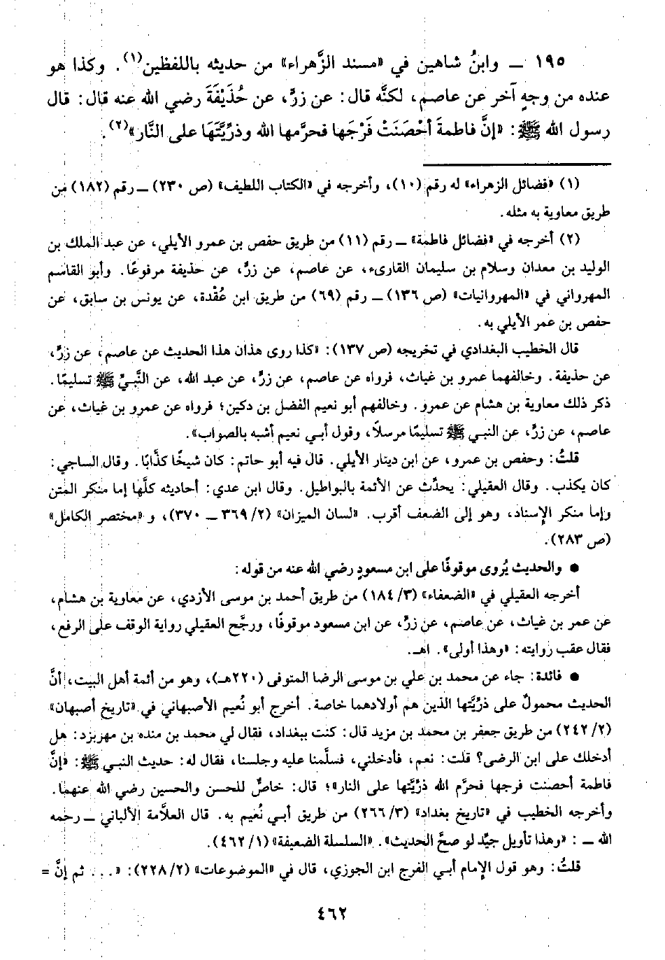 ١٩٥ - وابنُ شاهين في "مسند الزَّهراء" من حديثه باللفظين (¬١). وكذا هو عنده من وجهٍ آخر عن عاصم، لكنَّه قال: عن زرٍّ، عن حُذَيْفَةَ رضي الله عنه قال: قال رسول الله -صلى الله عليه وسلم-: "إنَّ فاطمةَ أحْصَنَتْ فَرْجَها فحرَّمها الله وذرِّيَّتَهَا على النَّار" (¬٢).