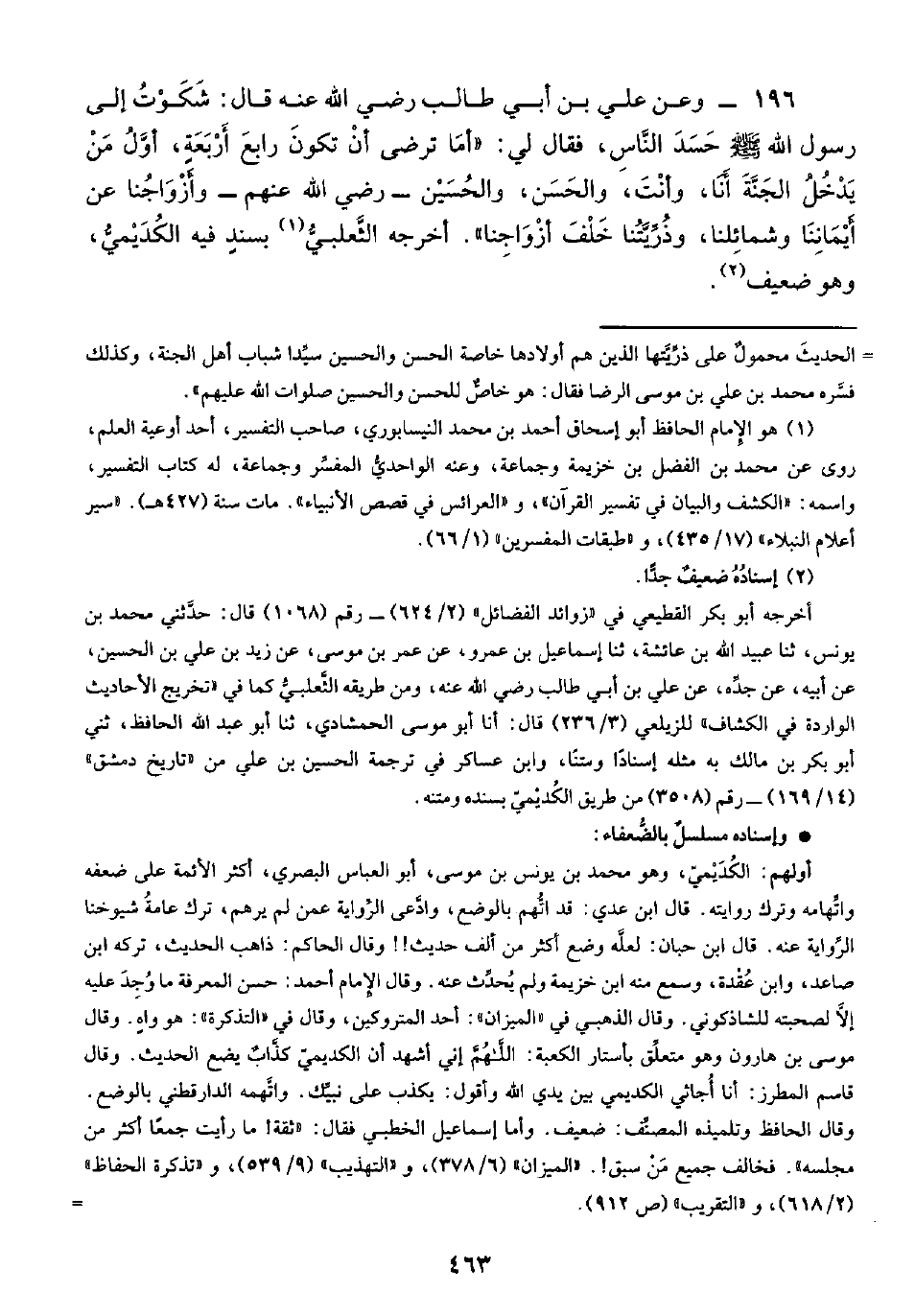 ١٩٦ - وعن علي بن أبي طالب رضي الله عنه قال: شَكَوْتُ إلى رسول الله -صلى الله عليه وسلم- حَسَدَ النَّاسِ، فقال لي: "أمَا ترضى أنْ تكونَ رابعَ أَرْبَعَةٍ، أوَّلُ مَن يَدْخلُ الجَنَّةَ أَنَا، وأنْتَ، والحَسَن، والحُسَيْن -رضي الله عنهم- وأَزْوَاجُنا عن أَيْمَانِنَا وشمائِلنا، وذُرِّيَّتُنا خَلْفَ أزْوَاجِنا". أخرجه الثَّعلبيُّ (¬١) بسندٍ فيه الكُدَيْميُّ، وهو ضعيف (¬٢).