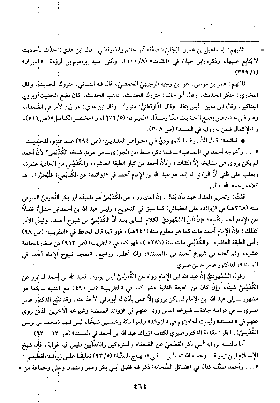 • فائدة: قال الشَّريف السَّمْهوديُّ في "جواهر العقدين" (ص ٢٩٤) عند عزوه للحديث: " ... وأخرجه أحمد في "المناقب" -فيما ذكره سبط ابن الجوزي- من طريق شيخه الكُدَيْمي! لأنَّ أحمد لم يكن يروي عن مشايخه إلَّا الثقات؛ ولأنَّ أحمد من كبار الطبقة العاشرة، والكُدَيْمي من الحادية عشرة، ويغلب على ظني أن الراوي له إنما هو عبد الله بن الإِمام أحمد في "زوائده" عن الكُدَيْمي؛ فلْيُحرَّر". اهـ كلامه رحمه الله تعالى.