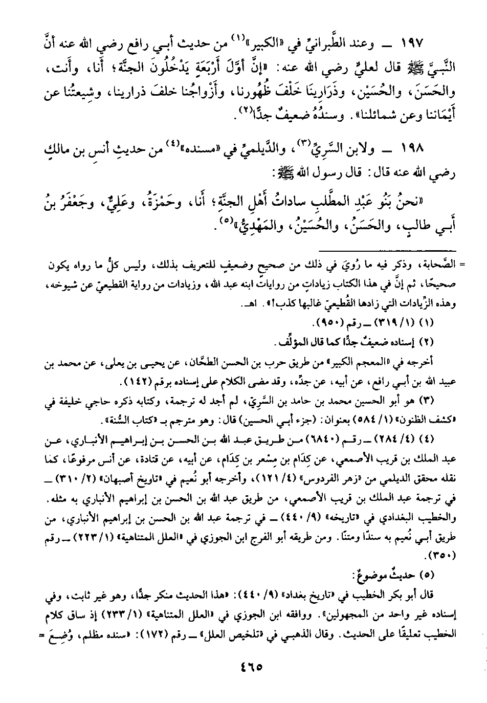 ١٩٧ - وعند الطَّبرانيِّ في "الكبير" (¬١) من حديث أبي رافع رضي الله عنه أن النَّبيَّ -صلى الله عليه وسلم- قال لعليٍّ رضي الله عنه: "إنَّ أوَّلَ أَرْبَعَةٍ يَدْخُلُونَ الجنَّة؛ أَنا، وأَنت، والحَسَنَ، والحُسَيْن، وذَرَارِينَا خَلْفَ ظُهُورنا، وأَزْواجُنا خلفَ ذرارينا، وشِيعتُنا عن أَيْمَاننا وعن شمائلنا". وسندُهُ ضعيفٌ جدًّا (¬٢).
