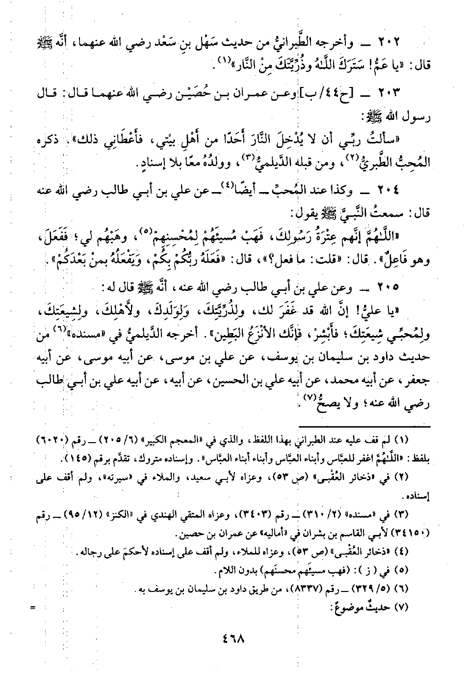 ٢٠٢ - وأخرجه الطَّبرانيُّ من حديث سَهْل بنِ سَعْد رضي الله عنهما، أنَّه -صلى الله عليه وسلم- قال: "يا عَمُّ! سَتَرَكَ اللهُ وذُرِّيَّتَكَ مِنْ النَّار" (¬١).