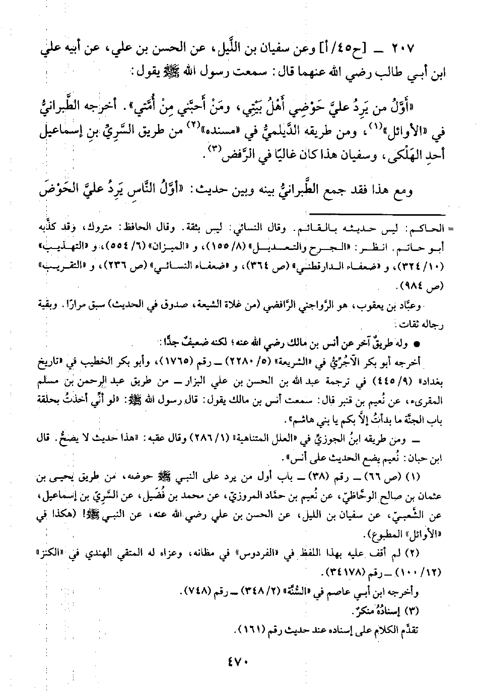 (¬١) (ص ٦٦) - رقم (٣٨) - باب أول من يرد على النبي -صلى الله عليه وسلم- حوضه، من طريق يحيى بن عثمان بن صالح الوحَّاظيّ، عن نُعيم بن حمَّاد المروزيّ، عن محمد بن فُضَيل، عن السَّرِيّ بن إسماعيل، عن الشَّعبيّ، عن سفيان بن الليل، عن الحسن بن علي رضي الله عنه، عن النبي -صلى الله عليه وسلم-! (هكذا في "الأوائل" المطبوع).