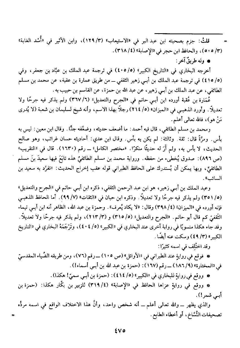 وعبد الملك بن أبي زهير، هو ابن عبد الرحمن الثقفي، ذكره ابن أبي حاتم في "الجرح والتعديل" (٥/ ٣٥١) ولم يذكر فيه جرحًا ولا تعديلًا. وذكره ابن حبان في "الثقات" (٧/ ٩٩). أما الحافظ الذهبي فإنه أورده في "الميزان" (٤/ ٣٩٨) وقال: "لا يكاد يُعرف". وحمزة بن عبد الله، الظاهر أنه ابن أبي تيماء الثّقفيّ كم قال أبو حاتم. "الجرح والتعديل" (٥/ ٣١٥) و (٣/ ٢١٣)، ولم يذكر فيه جرحًا ولا تعديلًا. وقد جاء هكذا منسوبًا في رواية أخرى عند البخاري في "الكبير" (٥/ ٤٠٤)، وتَرْجَمَهُ البخاري في "التاريخ الكبير" (٣/ ٤٩) وسكت عنه أيضًا.