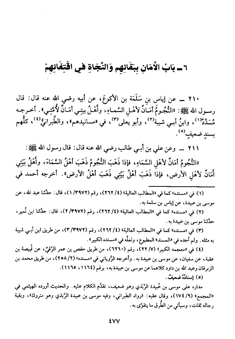 ٢١٠ - عن إياس بنِ سَلَمَة بن الأكوعَ، عن أبيه رضي الله عنه قال: قال رسول الله -صلى الله عليه وسلم-: "النُّجُومُ أمَانٌ لأهْلِ السَّماءِ، وأهْلُ بيتِي أمَانٌ لأُمَّتِي". أخرجه مُسَدَّدٌ (¬١)، وابنُ أبي شيبة (¬٢)، وأبو يعلى (¬٣)، في "مسانيدهم"، والطَّبرانيُّ (¬٤)، كلُّهم بسندٍ ضعيفٍ (¬٥).