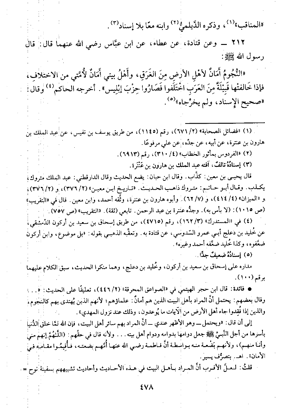 • فائدة: قال ابن حجر الهيتمي في "الصواعق المحرقة" (٢/ ٤٤٦)، تعليقًا على الحديث: " ... وقال بعضهم: يحتمل أن المراد بأهل البيت الذين هم أمانٌ: علماؤهم؛ لأنهم الذين يُهتدى بهم كالنجوم، والذين إذا فُقِدوا جاء أهل الأرض من الآيات ما يُوعدون، وذلك عند نزول المهدي".