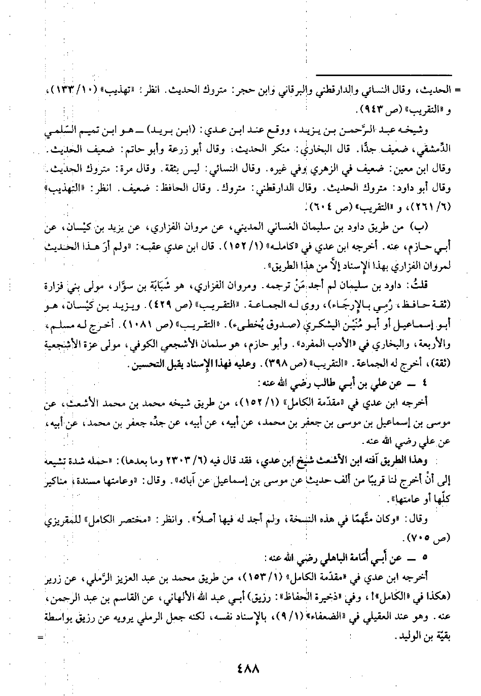 أخرجه ابن عدي في "مقدّمة الكامل" (١/ ١٥٢)، من طريق شيخه محمد بن محمد الأشعث، عن موسى بن إسماعيل بن موسى بن جعفر بن محمد، عن أبيه، عن أبيه، عن جدِّه جعفر بن محمد، عن أبيه، عن علي رضي الله عنه.