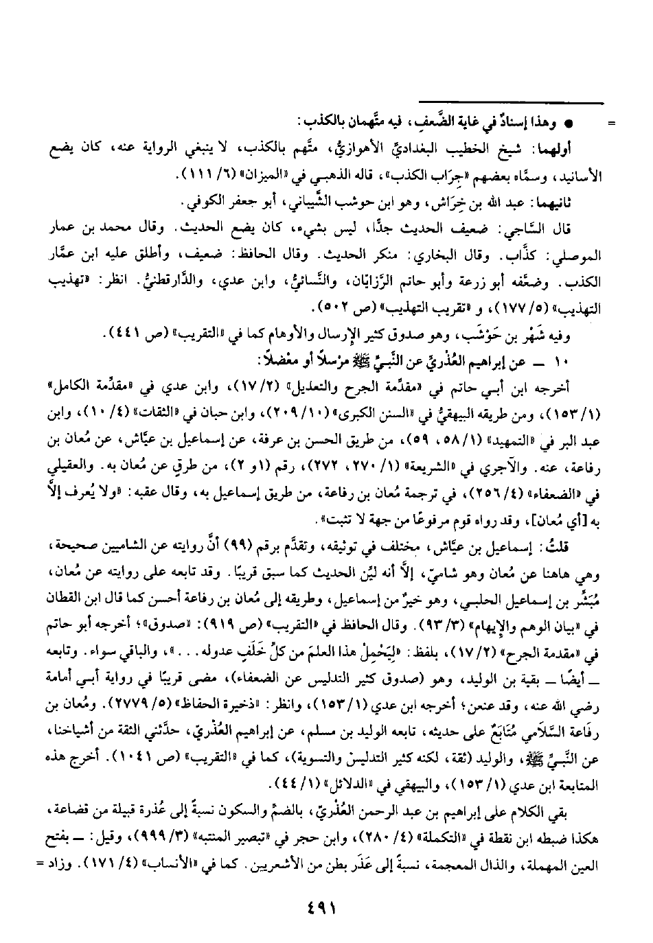 قلتُ: إسماعيل بن عيَّاش، مختلف في توثيقه، وتقدَّم برقم (٩٩) أن روايته عن الشاميين صحيحة، وهي هاهنا عن مُعان وهو شاميّ، إلَّا أنه ليِّن الحديث كما سبق قريبًا. وقد تابعه على روايته عن مُعان، مُبَشِّر بن إسماعيل الحلبي، وهو خيرٌ من إسماعيل، وطريقه إلى مُعان بن رفاعة أحسن كما قال ابن القطان في "بيان الوهم والإِيهام" (٣/ ٩٣). وقال الحافظ في "التقريب" (ص ٩١٩): "صدوق"؛ أخرجه أبو حاتم في "مقدمة الجرح" (٢/ ١٧)، بلفظ: "لِيَحْمِلْ هذا العلمَ من كلِّ خَلَفٍ عدوله ... "، والباقي سواء. وتابعه -أيضًا- بقية بن الوليد، وهو (صدوق كثير التدليس عن الضعفاء)، مضى قريبًا في رواية أبي أمامة رضي الله عنه، وقد عنعن؛ أخرجه ابن عدي (١/ ١٥٣)، وانظر: "ذخيرة الحفاظ" (٥/ ٢٧٧٩). ومُعان بن رفَاعة السَّلَامي مُتَابَعٌ على حديثه، تابعه الوليد بن مسلم، عن إبراهيم العُذْريّ، حدَّثني الثقة من أشياخنا، عن النَّبيِّ -صلى الله عليه وسلم-، والوليد (ثقة، لكنه كثير التدليسْ والتسوية)، كما في "التقريب" (ص ١٠٤١). أخرج هذه المتابعة ابن عدي (١/ ١٥٣)، والبيهقي في "الدلائل" (١/ ٤٤).