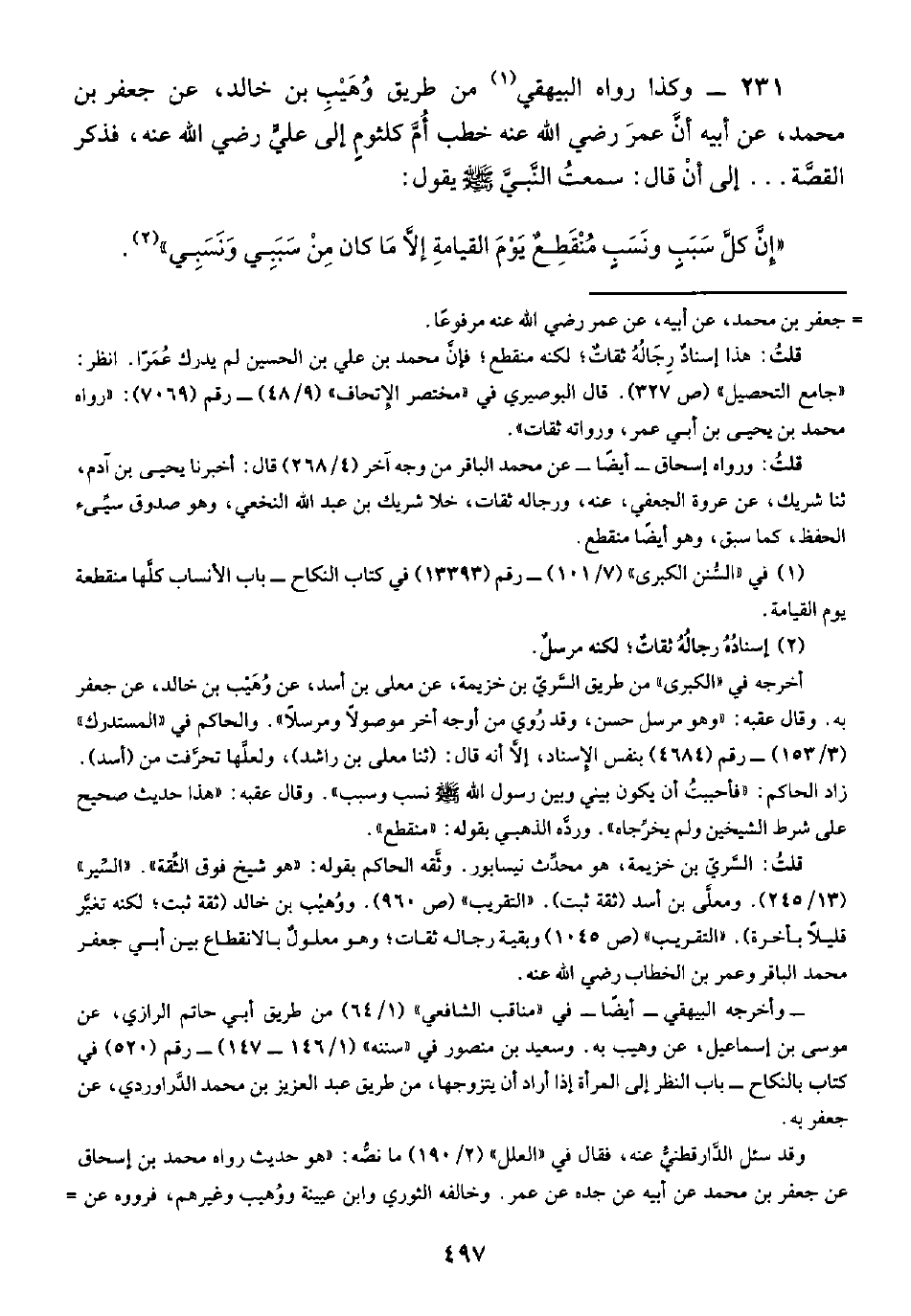 ٢٣١ - وكذا رواه البيهقي (¬١) من طريق وُهَيْبِ بن خالد، عن جعفر بن محمد، عن أبيه أن عمرَ رضي الله عنه خطب أُمَّ كلثومٍ إلى عليٍّ رضي الله عنه، فذكر القصَّة ... إلى أنْ قال: سمعتُ النَّبيَّ -صلى الله عليه وسلم- يقول: