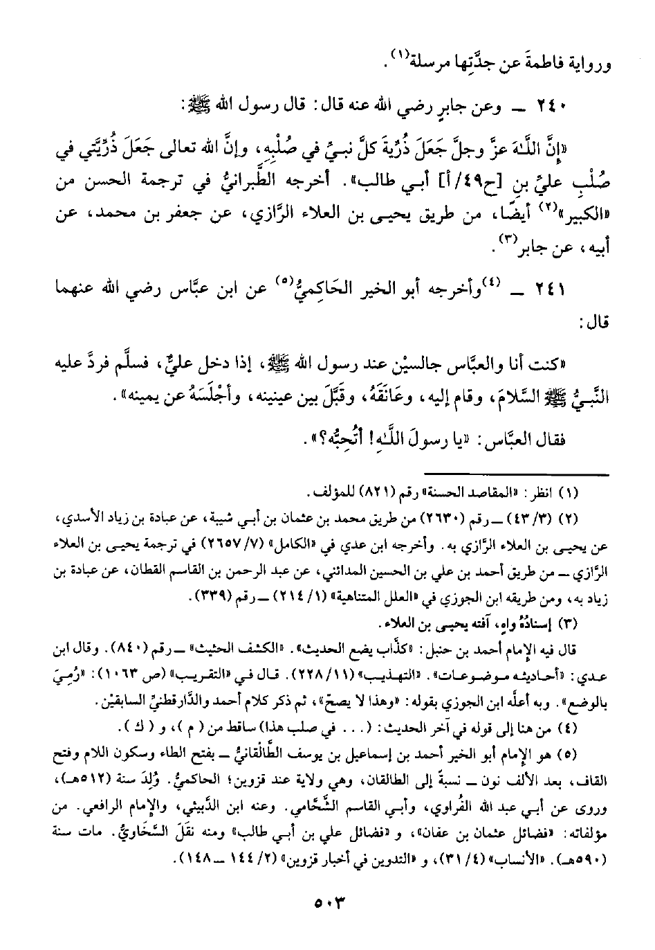 "إِنَّ اللهَ عزَّ وجلَّ جَعَلَ ذُريةَ كلَّ نبيِّ في صُلْبِهِ، وإنَّ الله تعالى جَعَلَ ذُرِّيَّتي في صُلْب عليِّ بنِ أبي طالب". أخرجه الطَّبرانيُّ في ترجمة الحسن من "الكبَير" (¬٢) أيضًا، من طريق يحيى بن العلاء الرَّازي، عن جعفر بن محمد، عن أبيه، عن جابر (¬٣).